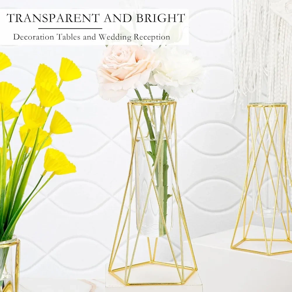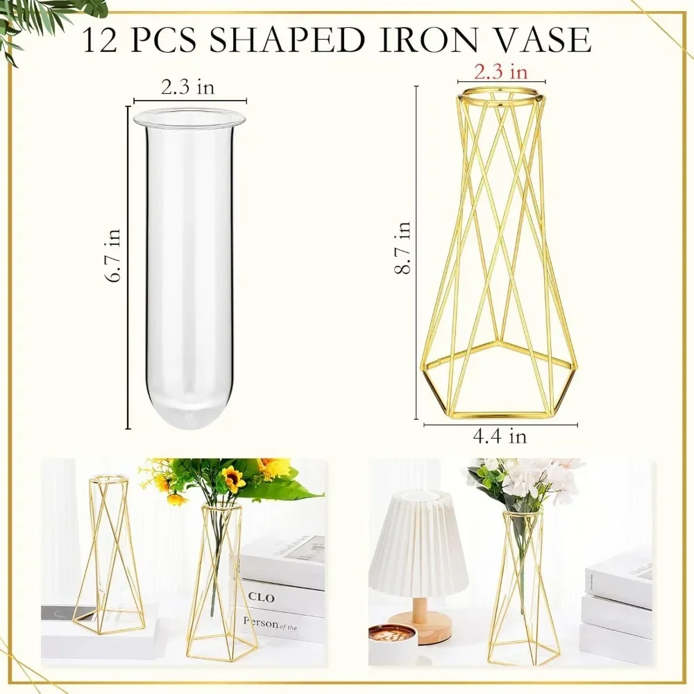 12 pieces of golden geometric modern vases, used for center decoration glass vases, with metal brackets for hydroponic plants