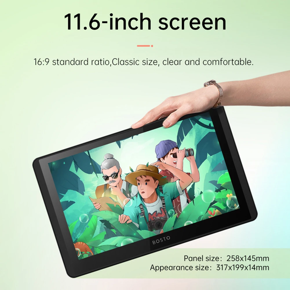 Features: 1. 11.6-inch IPS HD Screen with Vibrant Colors of Drawing Tablet Monitor: Enjoy a large and clear display with a resolution of 1366 * 768, 16.7 million rich color depth, 1000:1 contrast ratio, 250cd/㎡ brightness, and 178° viewing angle. 2. Battery-free Pen: The ergonomic design reduces fatigue from long-term use. The pen has 2 customizable buttons for convenient drawing. The magnetic side of the digital art tablet allows you to attach the pen, so you won’t forget it while carrying. 3. 8192 Pressure Levels for Precise Drawing: With 8192 pressure levels and a fast response time of 25ms, the digital art drawing pad provides a smooth and natural drawing experience. It also supports touch input for easy finger operation. Comes with a 2-in-1 USB cable with 4 different interfaces. Compatible with Windows 7 and above, compatible with Mac OS 10.11 and above. Can be connected to PCs/laptops. 4. Full Lamination HD Screen for Easy Use: The drawing tablet with screen features a gapless steel glass design, improving pressure sensitivity control accuracy and reducing visual deviation. The foldable all-metal stand allows you to tilt the tablet up to 19° for a comfortable position. 5. Wide Application Compatibility: Drawing tablet with screen is perfectly compatible with art software such as Photoshop, SAI, Clipstudio, Sketchbook, Artrage, CAD, Adobe Illustrator, Painter, Flash, and C4D. Ideal for digital illustration, design, animation, digital signatures, online education, and more. Includes 8 pen nibs, nib remover, cleaning cloth, glove, tablet protective case, 2-in-1 USB cable, battery-free pen, and quick guide.