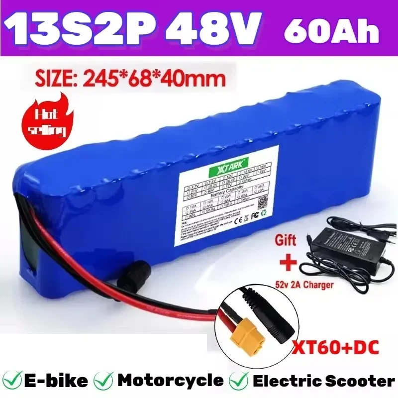 13S2P 48v battery pack 60Ah Lithium-ion Battery Pack with BMS +54.6V charger for 250W 350W 500W 750W 1000W 48v 18650 battery
