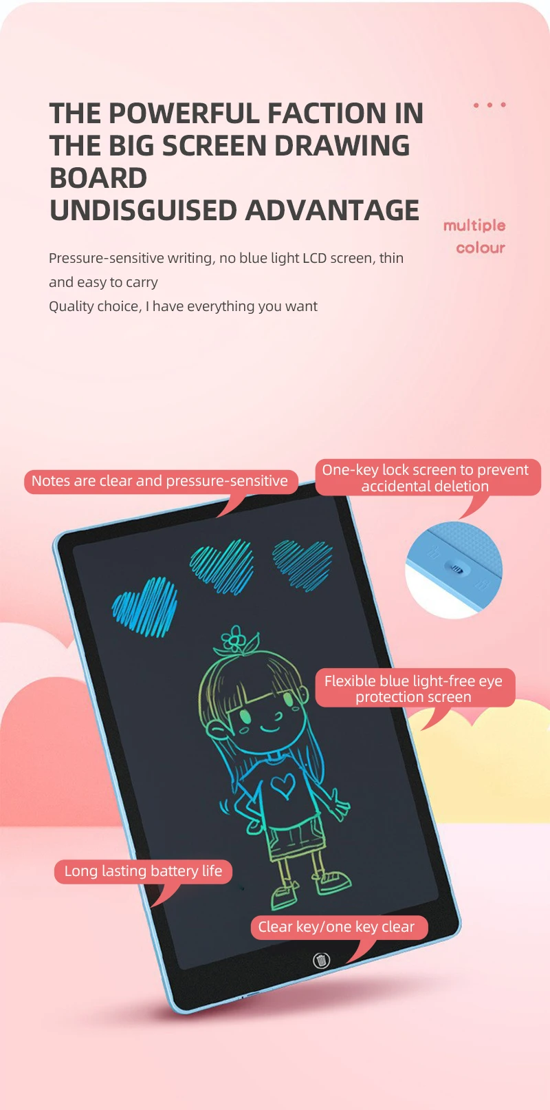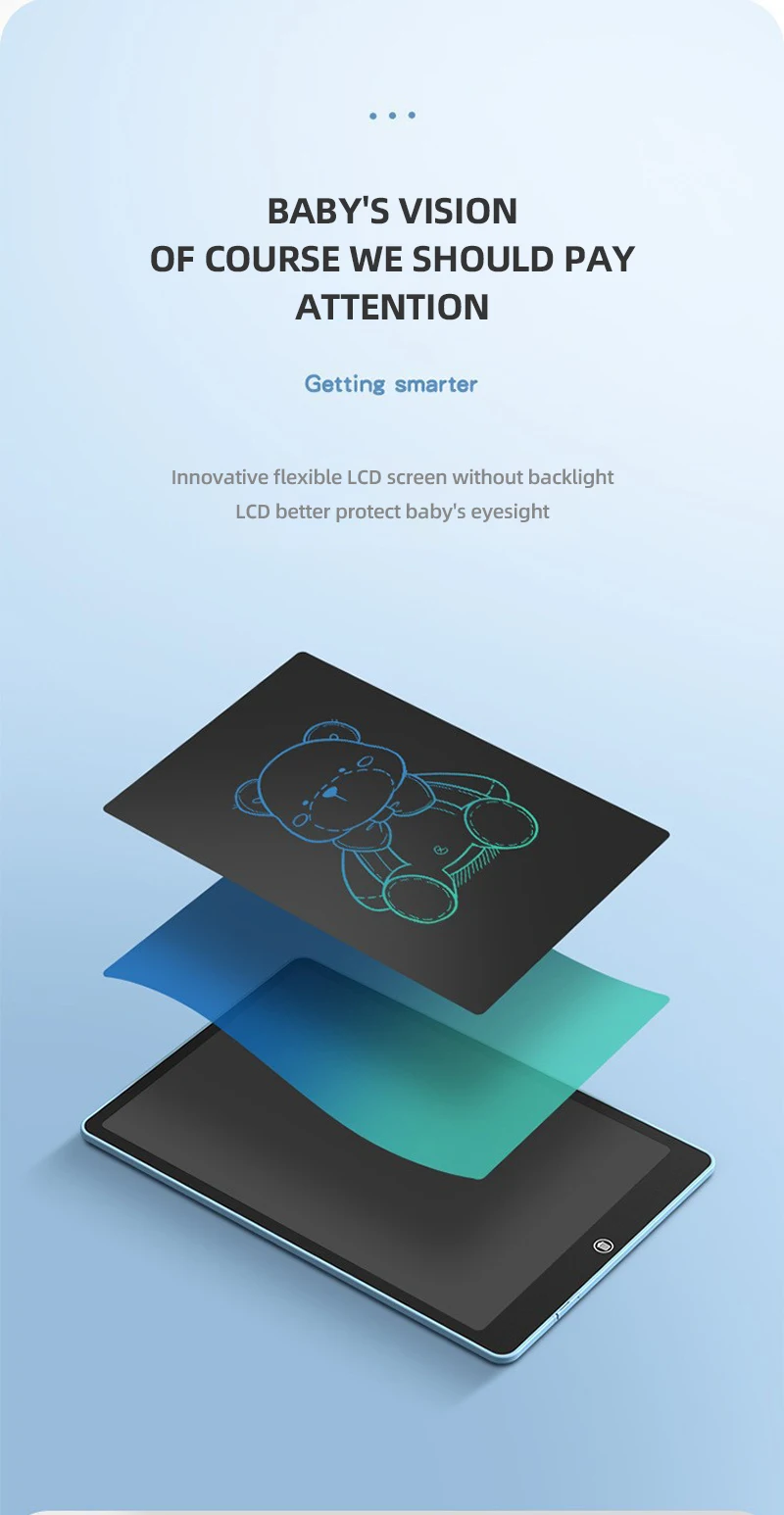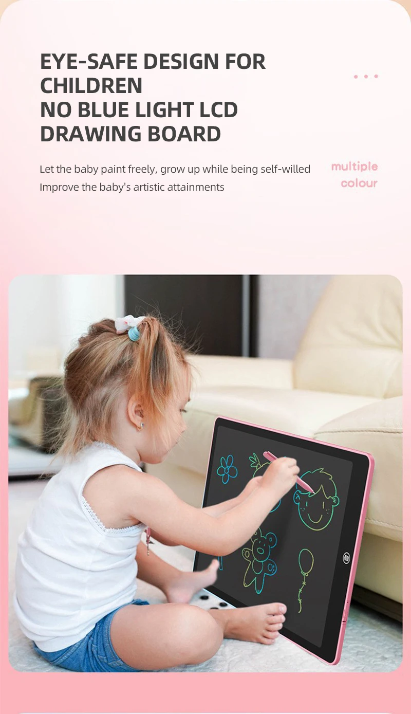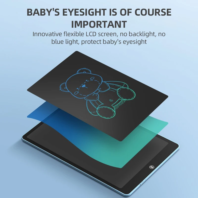 3.LCD drawing tablet is radiation-free and eye protected. NO BLUE LIGHT or glare harm kids' eyes. It's 100% safe and healthy for child long time use.