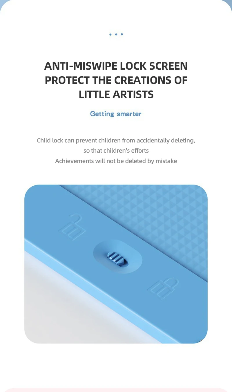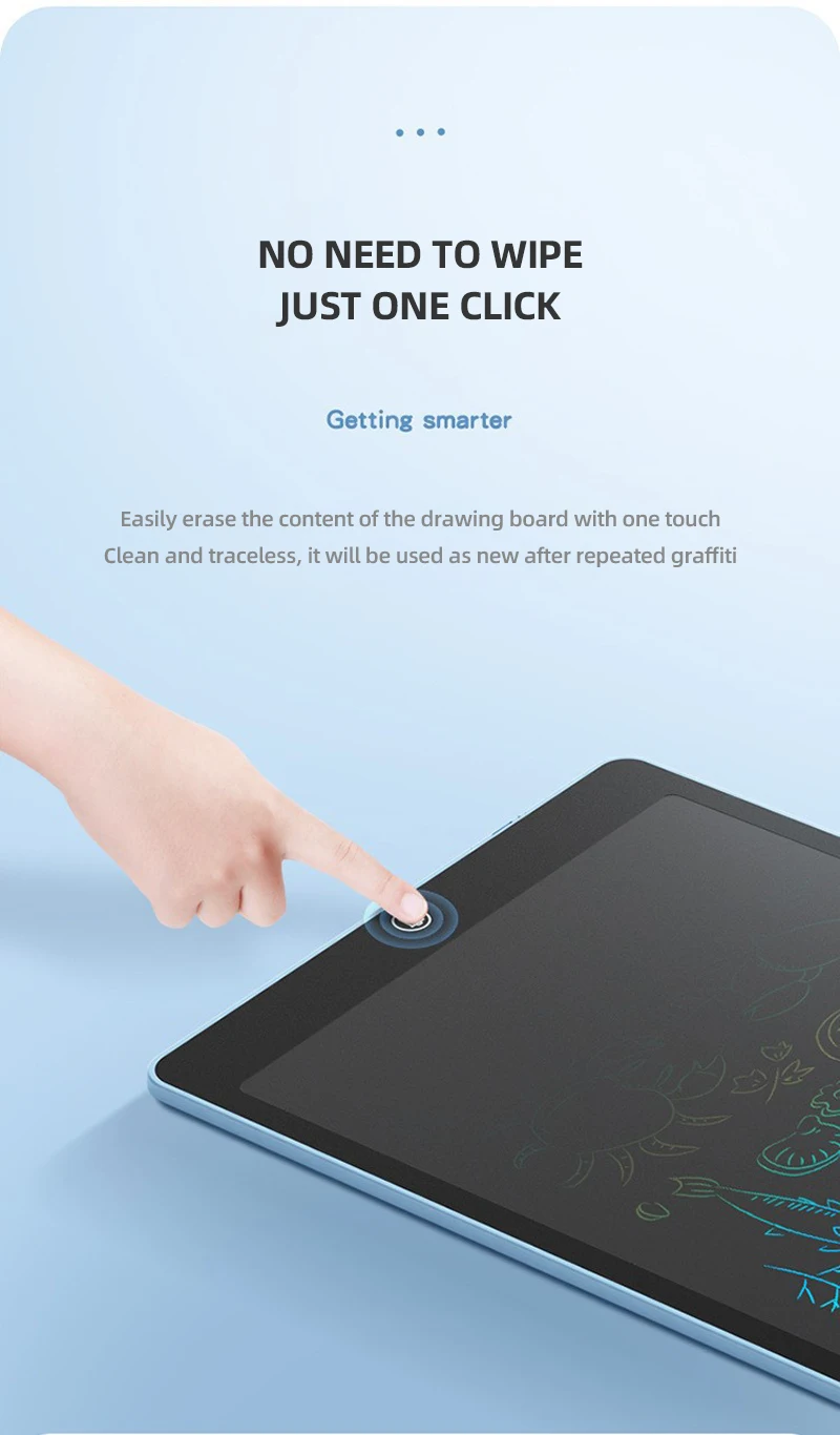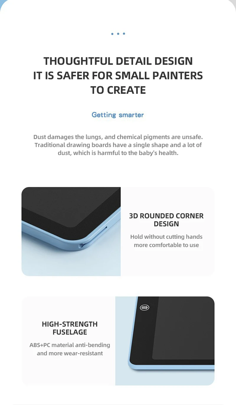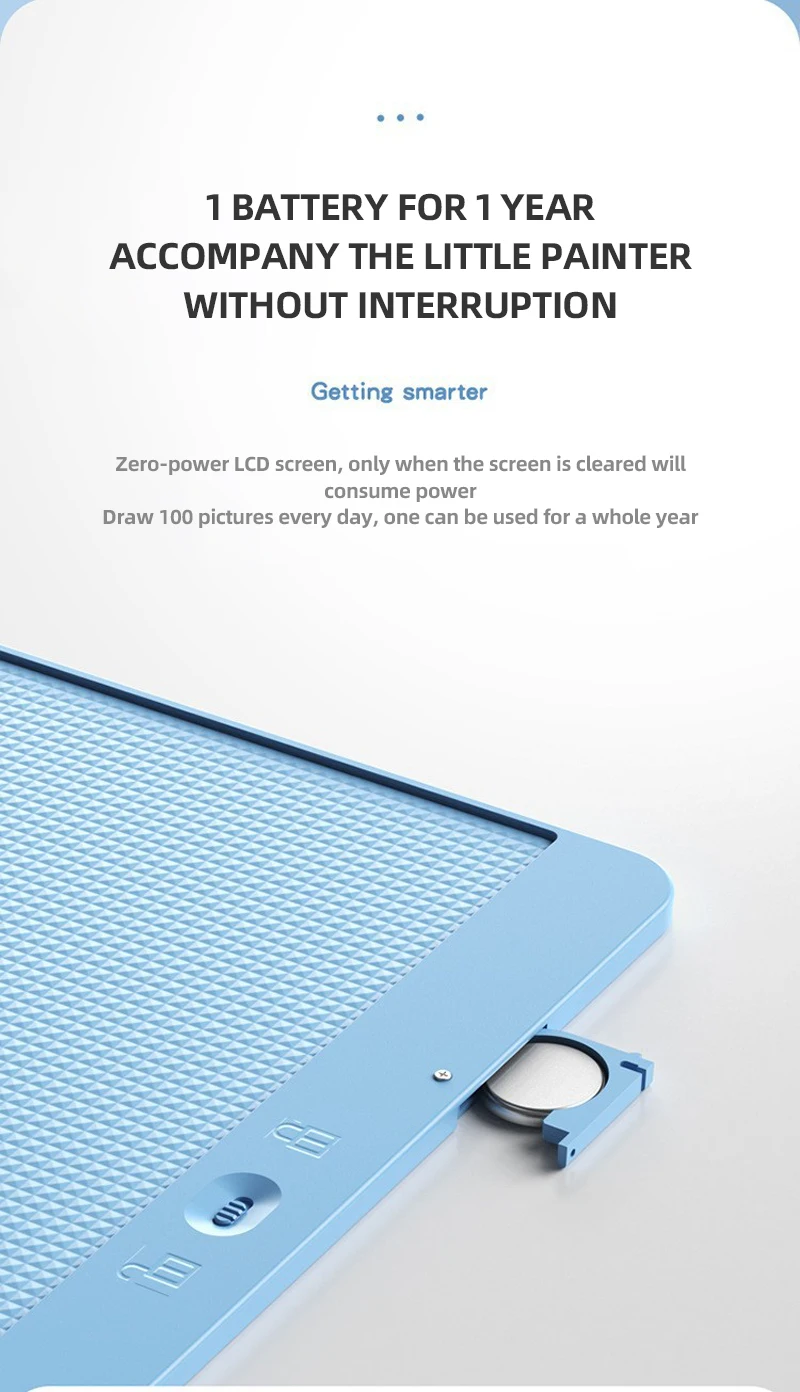3.LCD drawing tablet is radiation-free and eye protected. NO BLUE LIGHT or glare harm kids' eyes. It's 100% safe and healthy for child long time use.