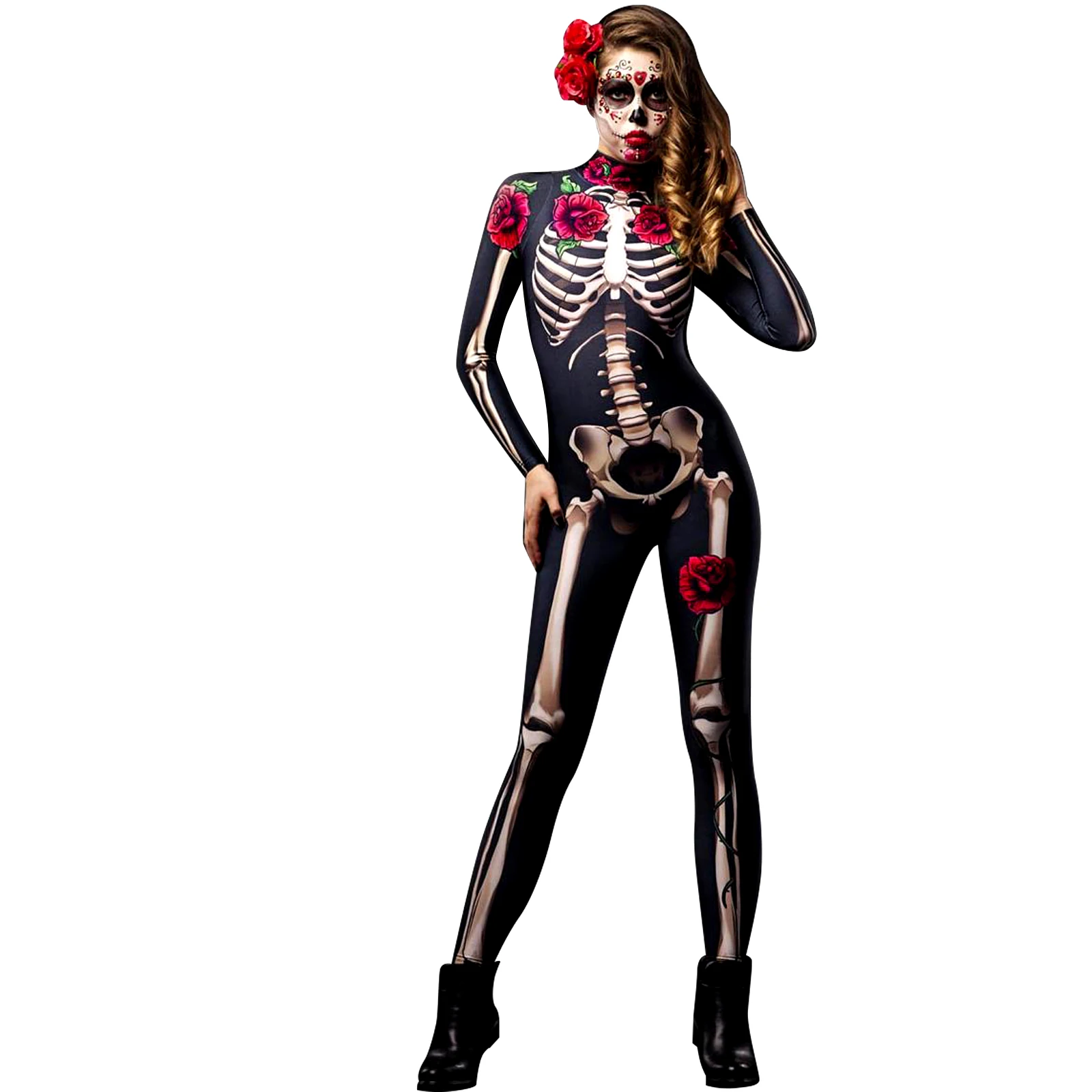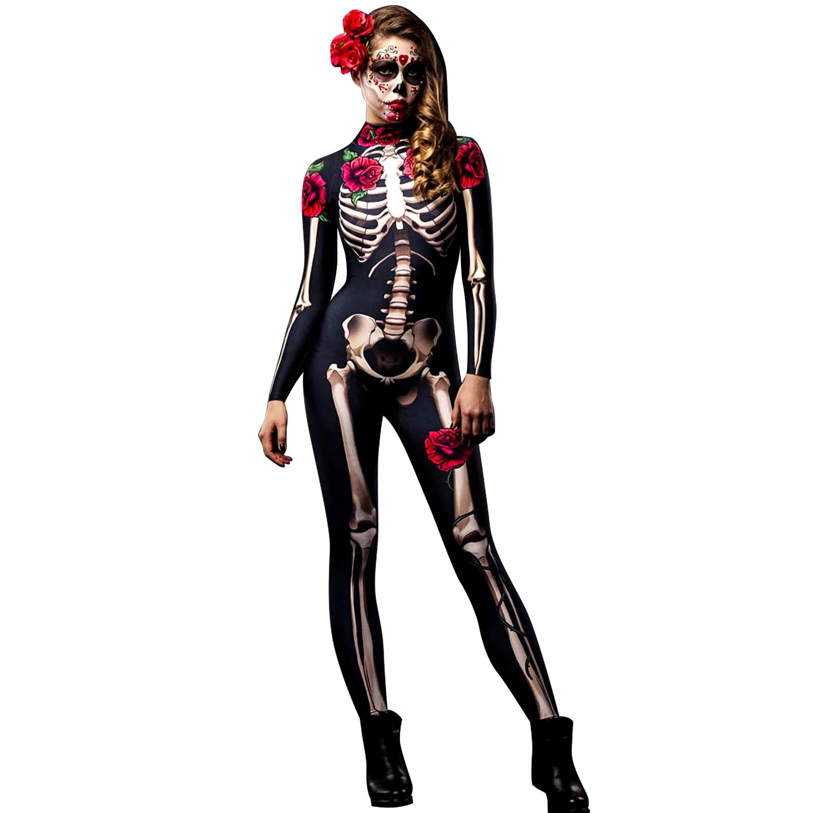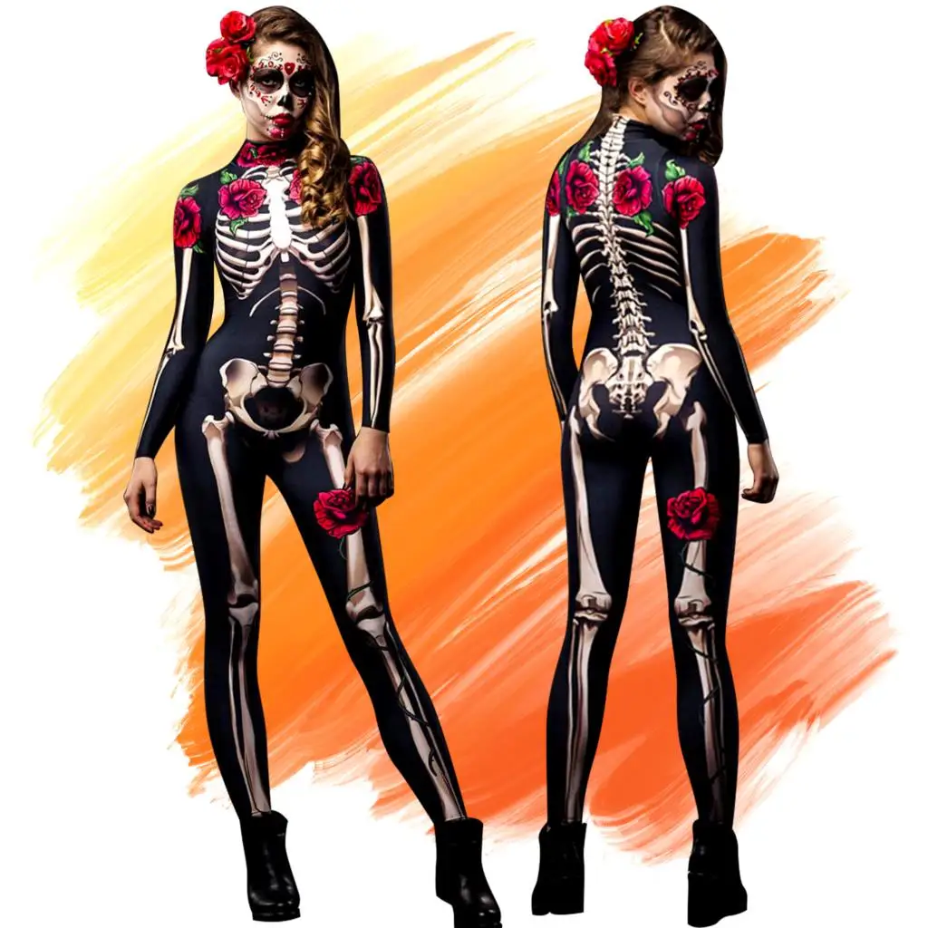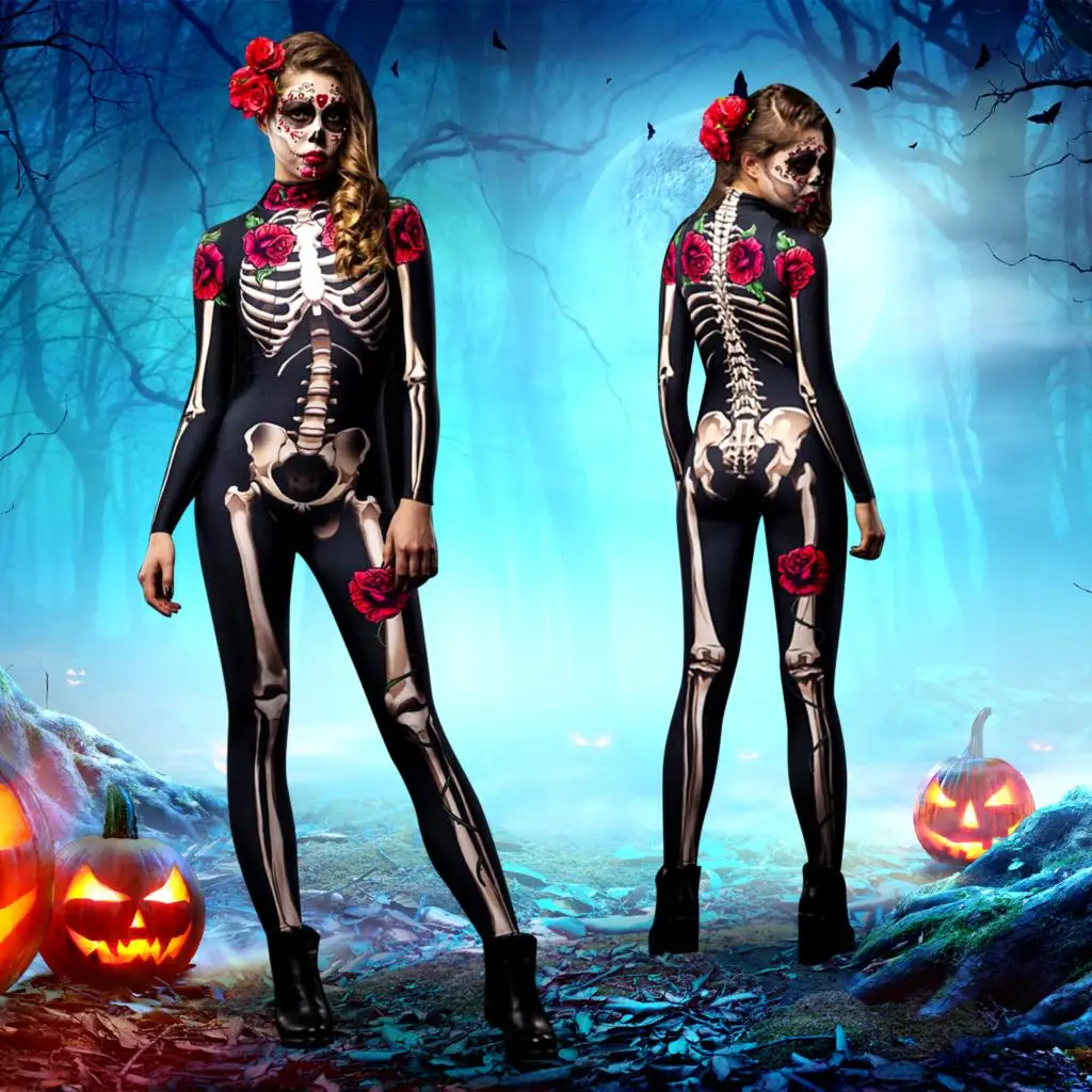 1PCS Party City Day of the Dead Catsuit Skeleton Costume Jumpsuit for Halloween Women’s Halloween Costume, Dia de Los Muertos