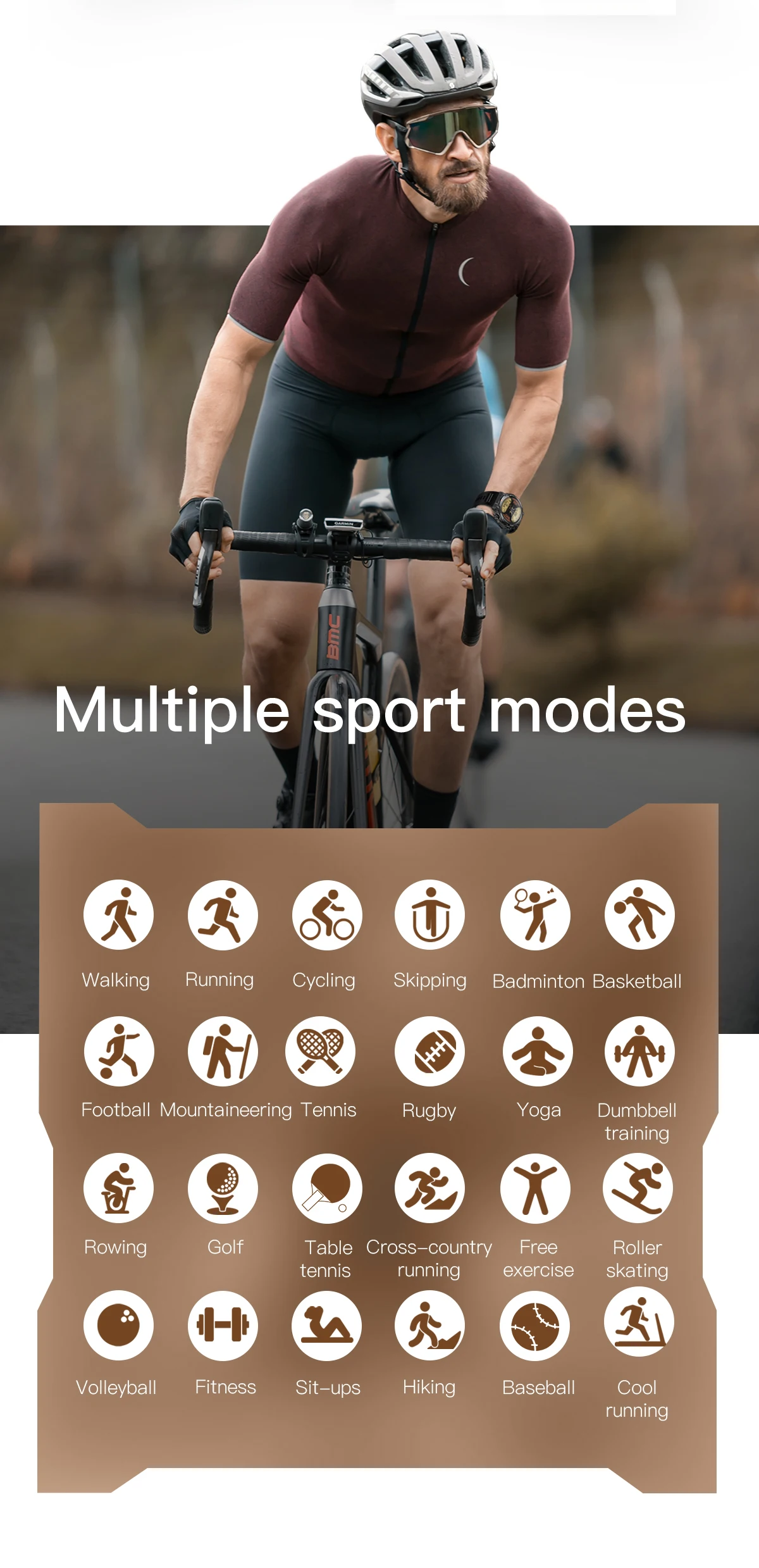 * Multiple sports modes:running,walking,cycling,badminton,basketball,football,rope skipping.etc(100+ sports modes)