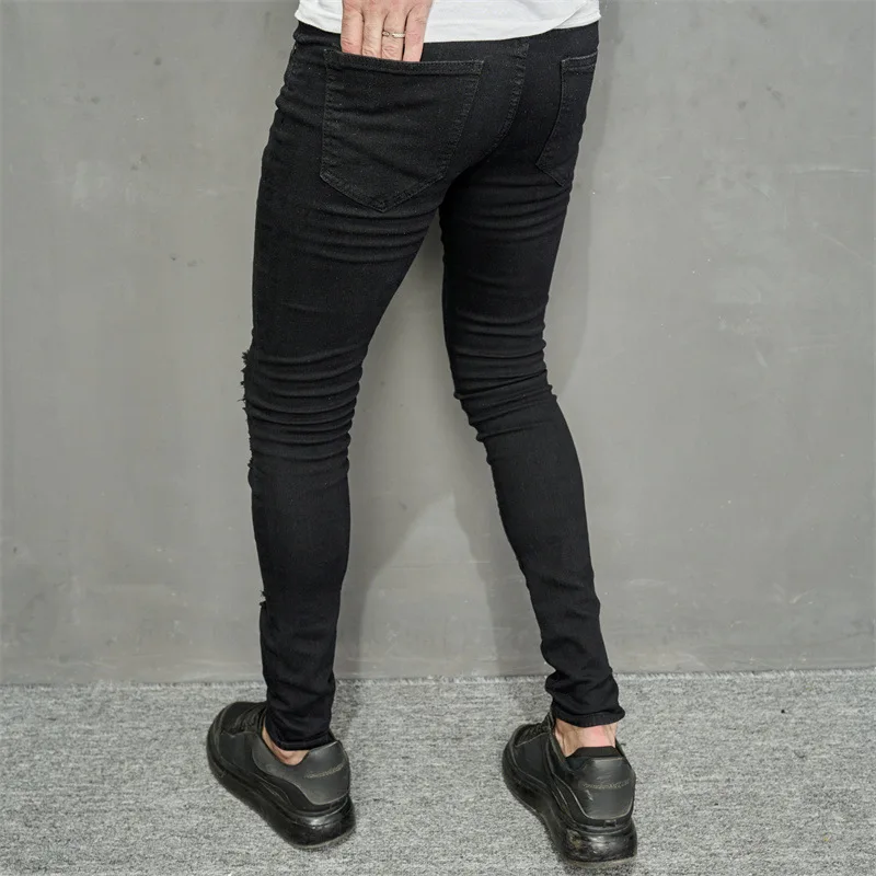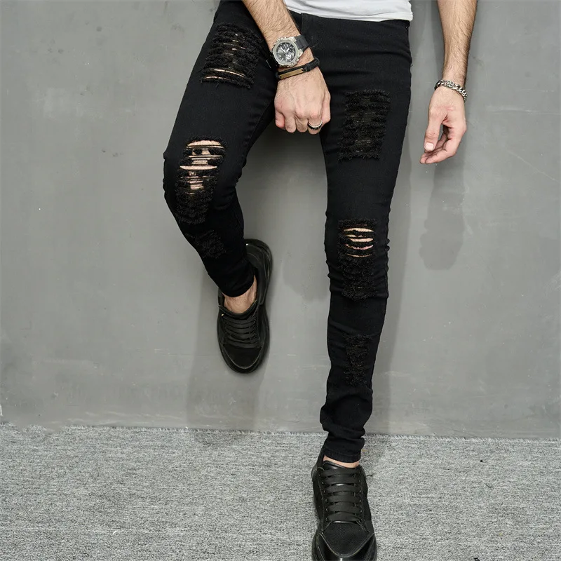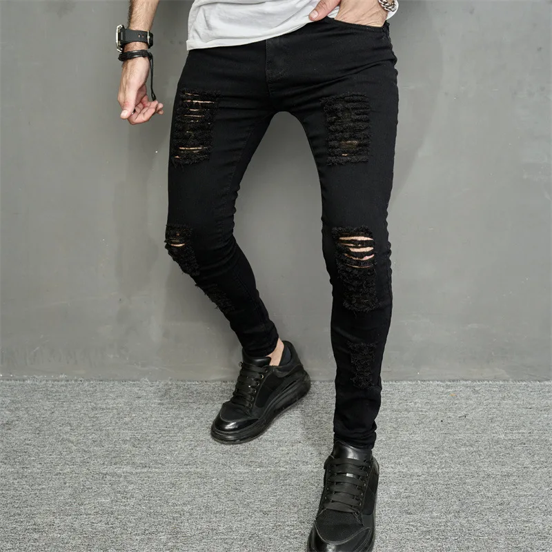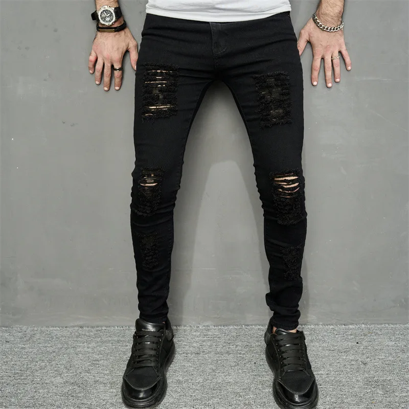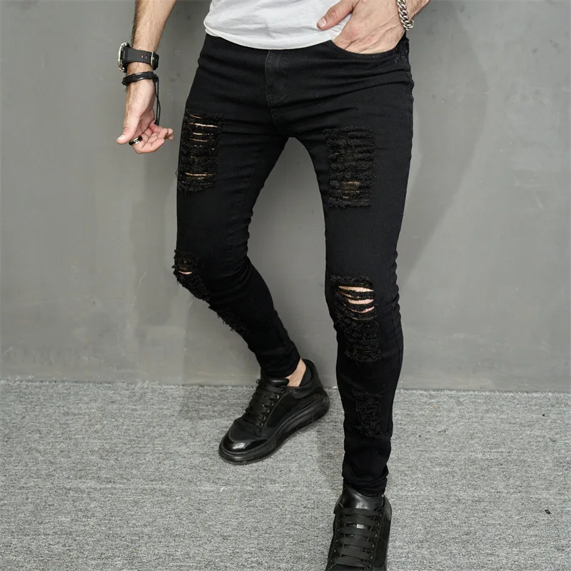 2024 New European and American Style Men’s High Street Casual Ripped Slim-Fit Personalized Trendy Solid Color Ankle-Length Jeans