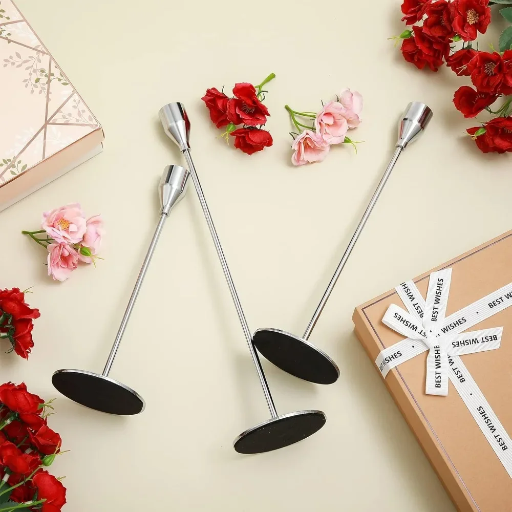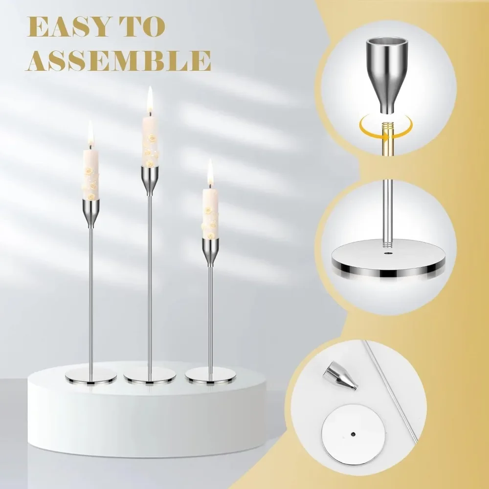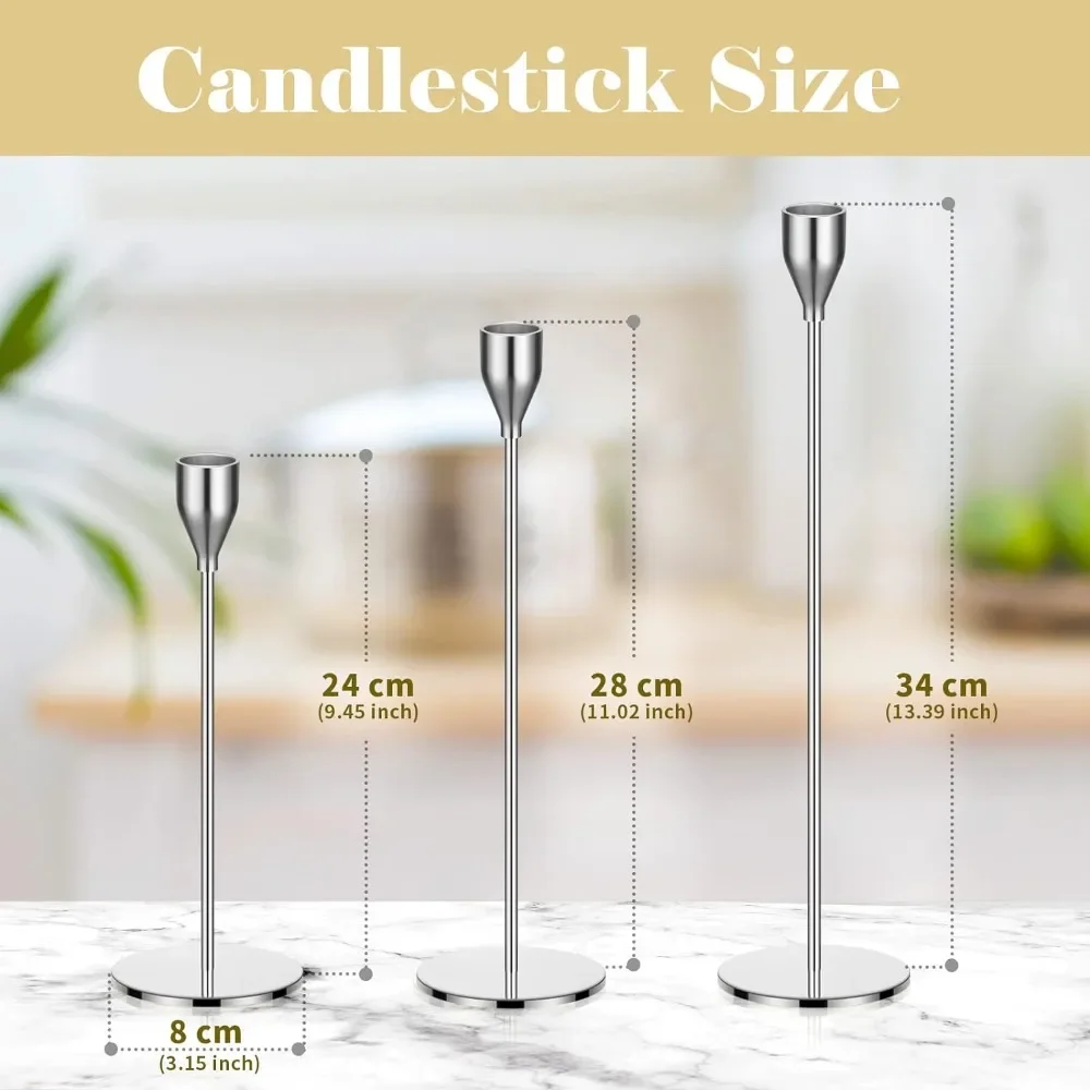- Assorted Size: the candle sticks holders with 3 different heights, include 3 assorted heights, 34 cm/ 13.4 inch, 28 cm/ 11 inch, 24 cm/ 9.5 inch, ideal for standard 3/4 inch taper candle or battery operated tapered candle