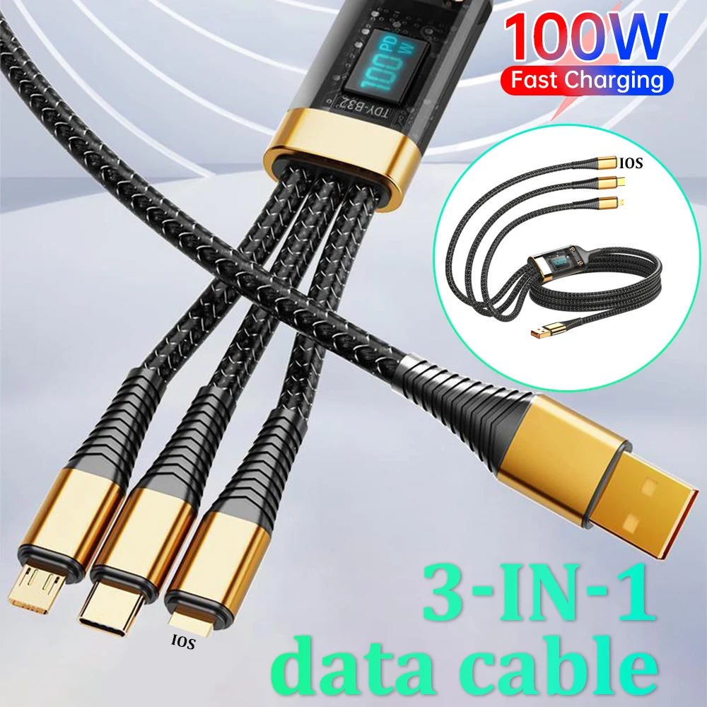 3 in 1 100W Digital Transparent Charging Cable Super Fast Charging 3 in 1 Data Cable Suitable For Apple Huawei Xiaomi Phones