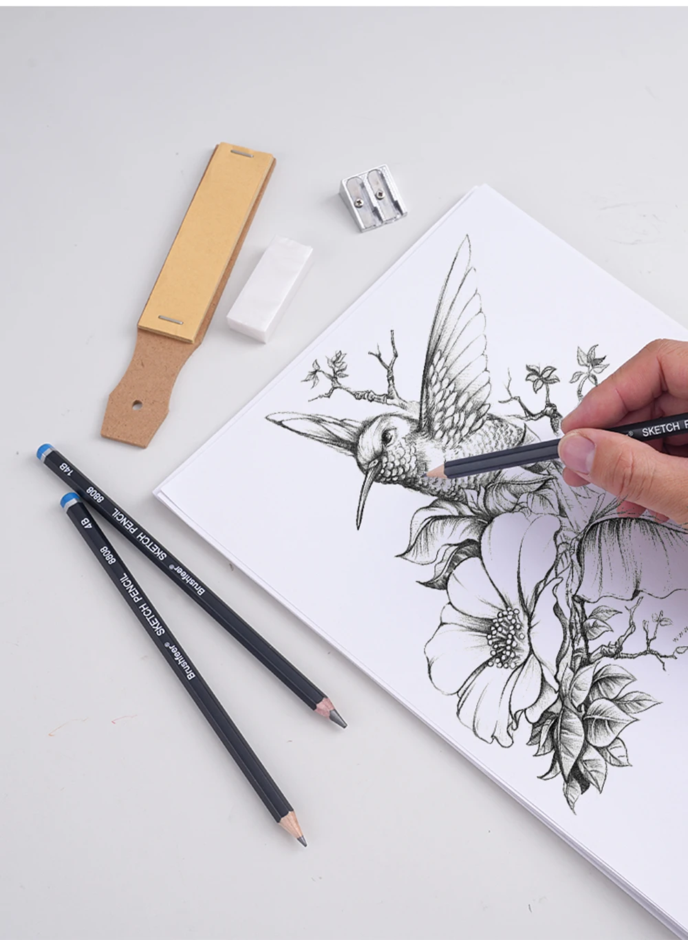A set of graphite pencils (3H, 2H, H, HB, 2B, 3B, 4B, 5B, 6B, 8B, 10B, 12B) one each, sandpaper board 1, eraser 1, soft clay eraser 1, double-hole pencil sharpener 1, paper blending brush 3, charcoal sticks (soft, medium, hard) 1 each, craft knife 1, extender 1, willow charcoal sticks 2