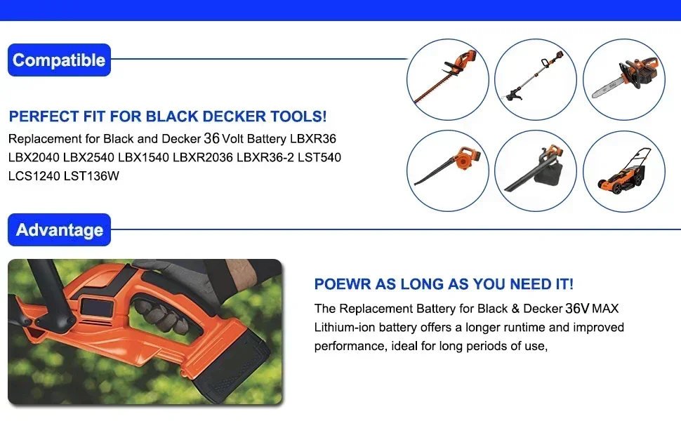 36V/40V 6Ah Replacement Battery for Black & Decker 36V~40V LBX2040 LBX36 LBXR36 LBXR2036 LST540 LCS1240 Cordless Tool Battery
