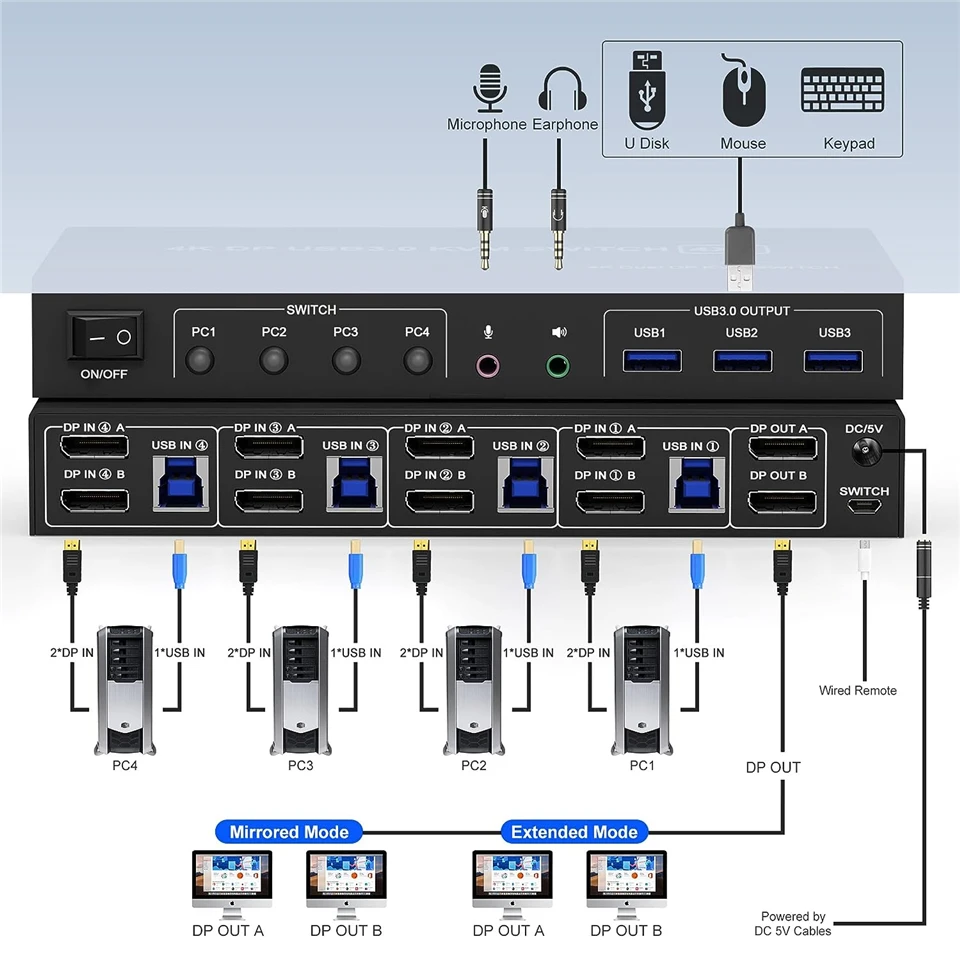 4 Port HDMI KVM USB 3.0 Switch 4X2 Dual Monitor 4K@60Hz Extended Display DP KVM Switch 4 In 2 Out for 4 PC Share Keyboard Mouse