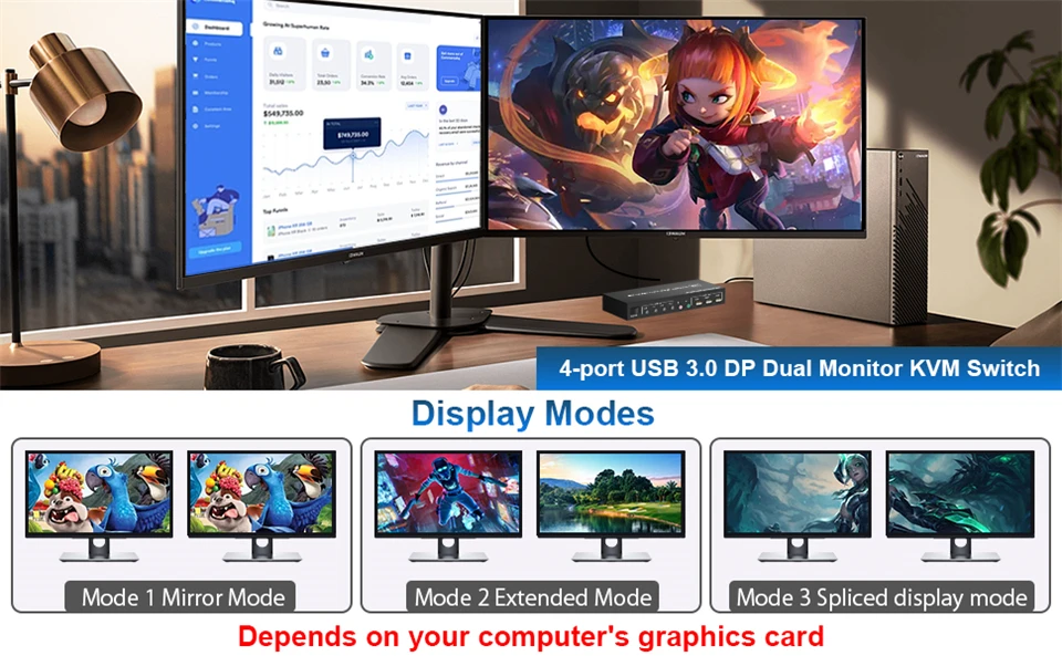 ★【USB 3.0 KVM Switch Dual Monitor DisplayPort 4 Port 】This dual monitor 4 IN 2 OUT DP KVM Switch is for you to control them using one set of keyboard, mouse and single or dual monitors to make your work space tidy and efficient, also a premium choice for working from home. Only when your computer supports dual display or multi display, you can use this KVM to achieve 4 PC to share 2 monitors. (Extended, mirrored or spliced display modes depend on your computer's graphics card).