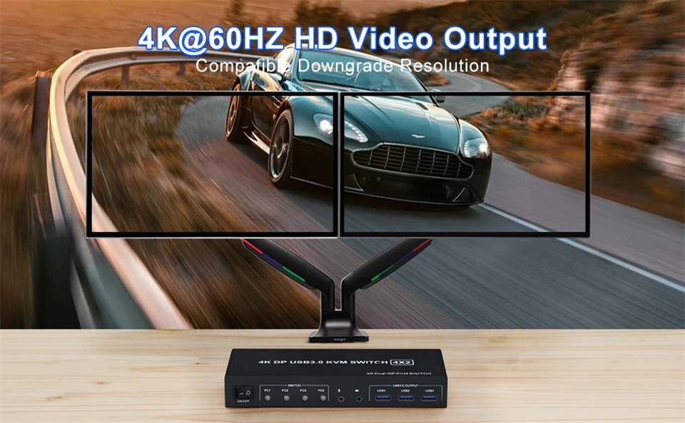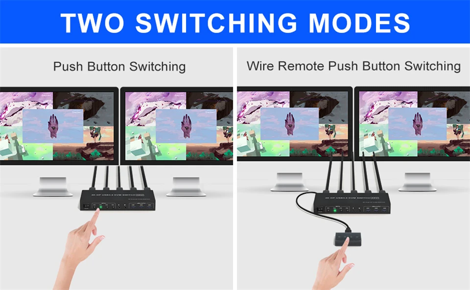 ★【Displayport KVM Switch up to 4K@60HZ】 This DP kvm dual monitor 4 port supporting high resolution max up to 4K@60Hz, and also supports 3D and 1080P@60Hz or other lower resolution (Downward Compatible). Complies with the DP 1.2 standard. Note: Only when both your computer Graphics card , monitor and DP cable support 4K@60Hz then you can get 4K@60Hz effect, so if you want the max resolution you have to check your devices first.