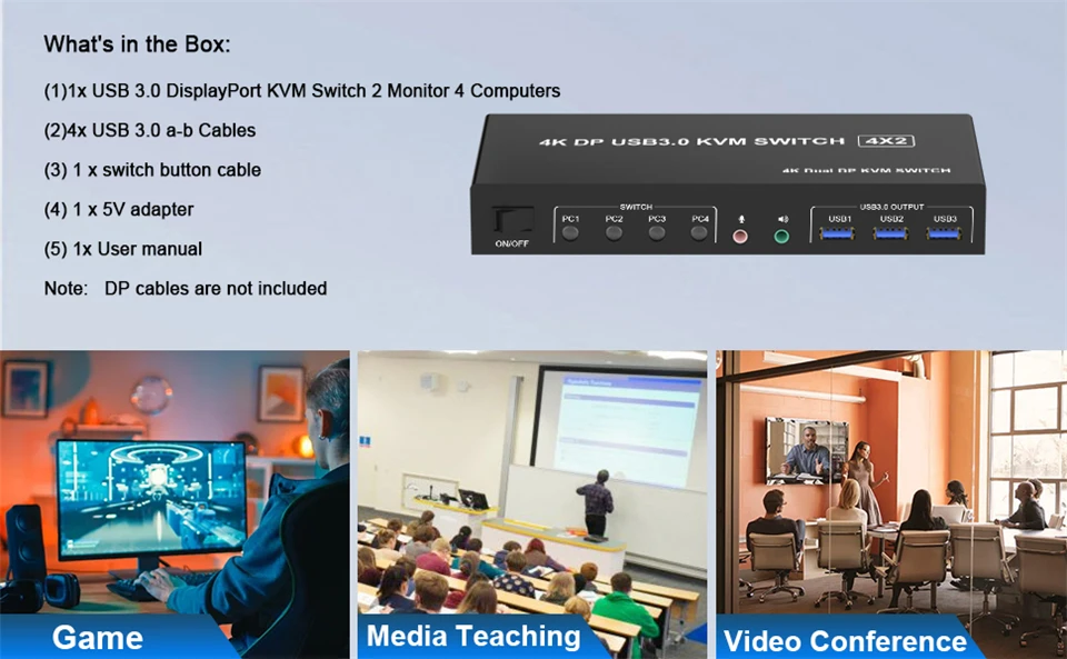 ★【DP KVM Switches with 3 USB 3.0 Ports】Dual monitor Displayport KVM switch with 3 USB 3.0 ports which can recognize keyboard,mouse,printer,scaner and other USB devices. USB 3.0 offers data transfer speeds of up to 5Gbps, while USB 2.0 offers data transfer speeds of only 480Mbps.
