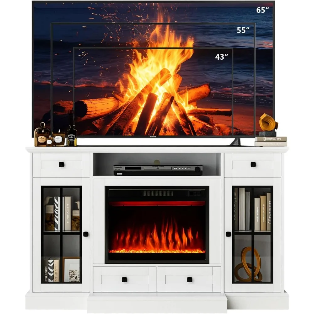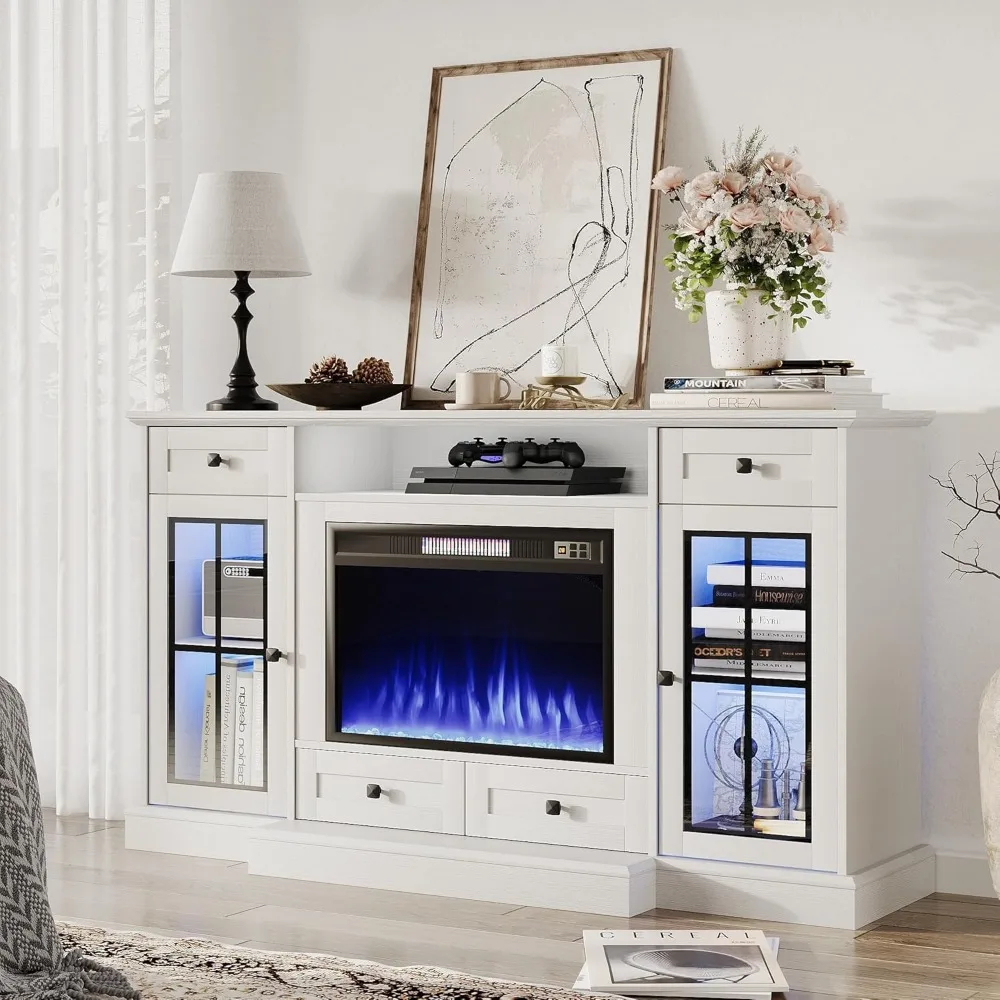 58” Fireplace TV Stand, TV Table for TVs up to 65 Inch, Entertainment Center with 23″ Electric Fireplace, Glass Doors