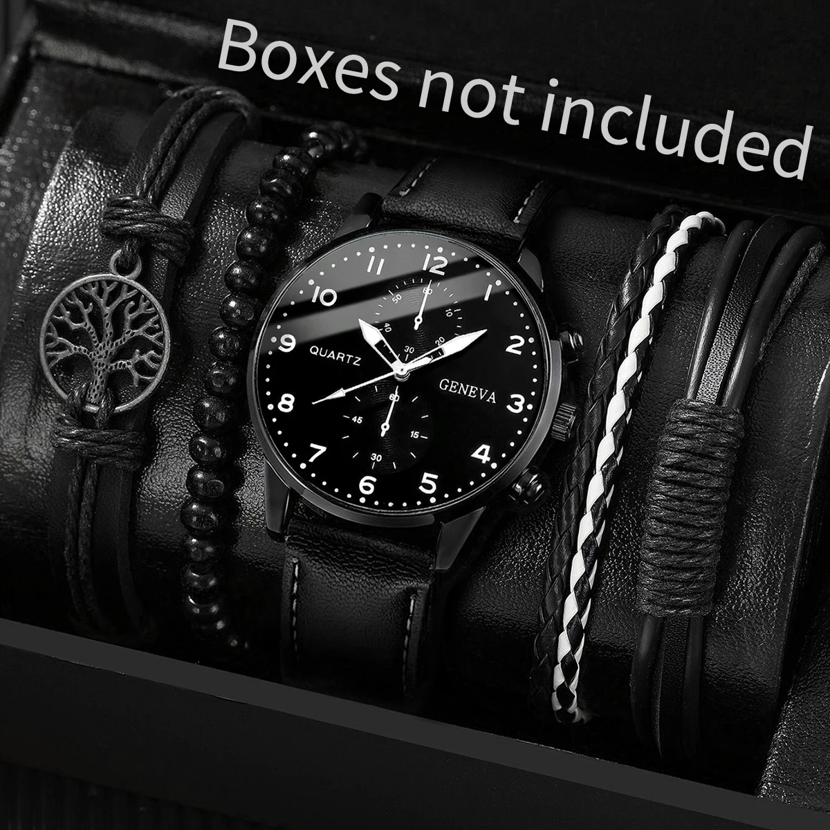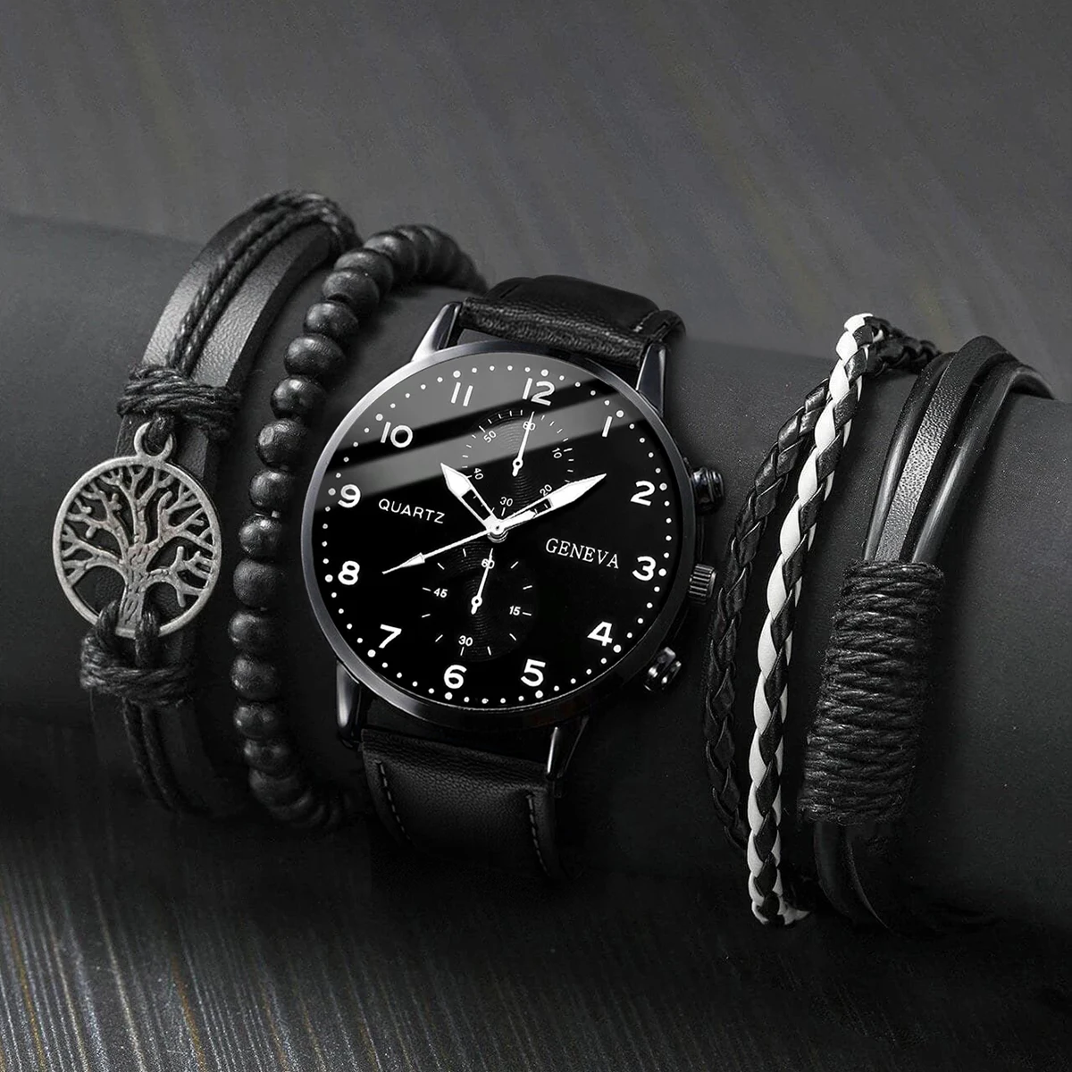 5PCS/Set Men’s Watch Fashion Arabic Dial Analog Quartz Watches Vintage Leather Bracelets Set(Without Box)