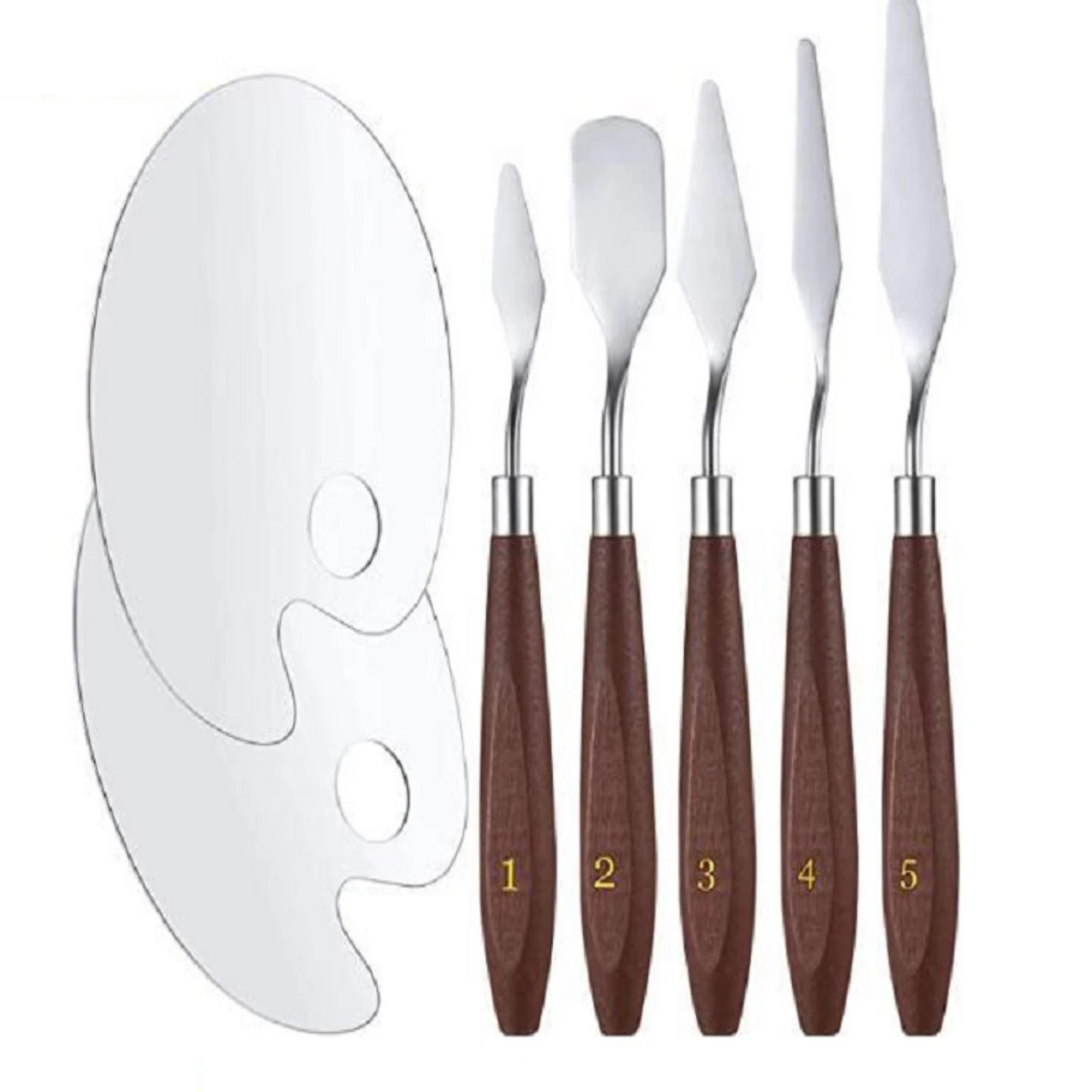 Painting knife set: The package contains 5 different sizes of palette knife painting tools and 2 painting palettes. Sufficient quantity and different shapes can meet your various needs.
