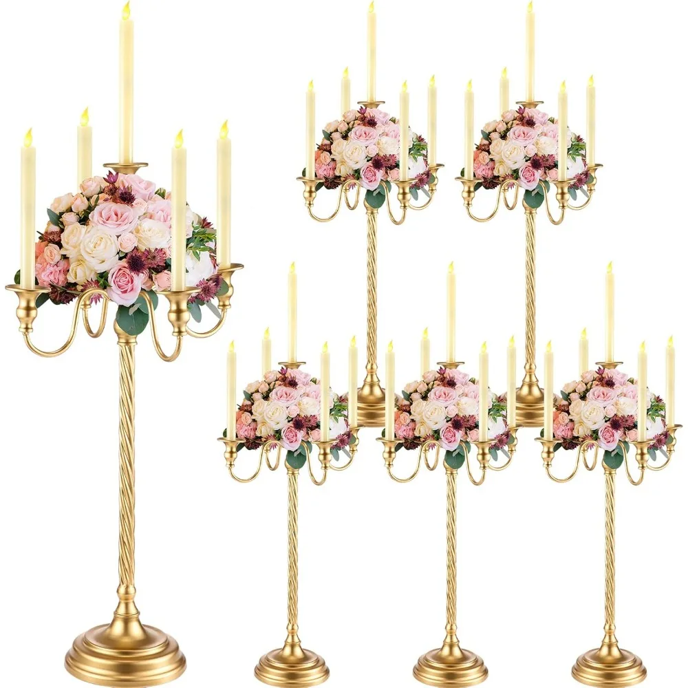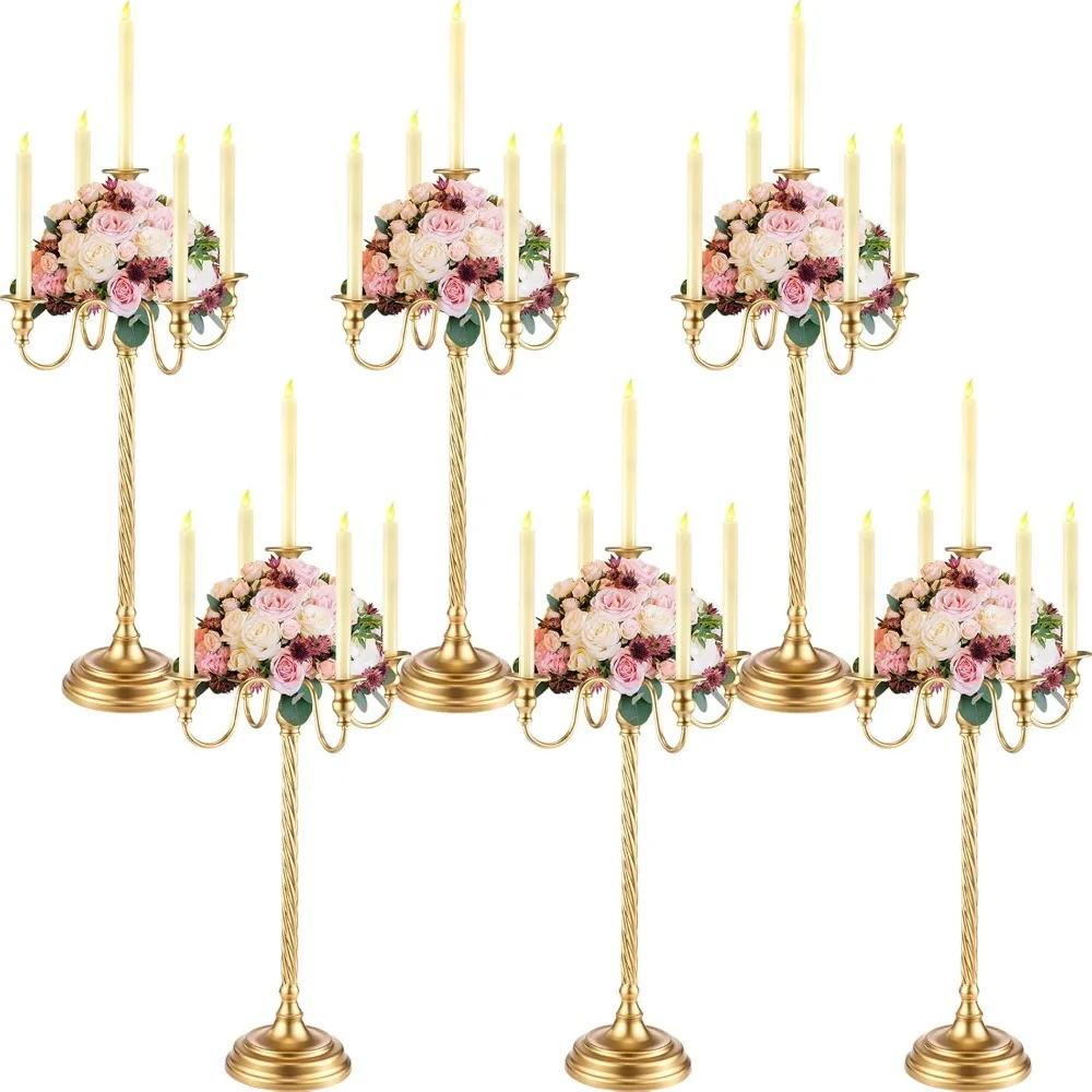 6-piece Set of Golden Candle Holders, 5-arm Cone-shaped Candle Holders for Wedding, Birthday, and Party Decoration (28 Inches)