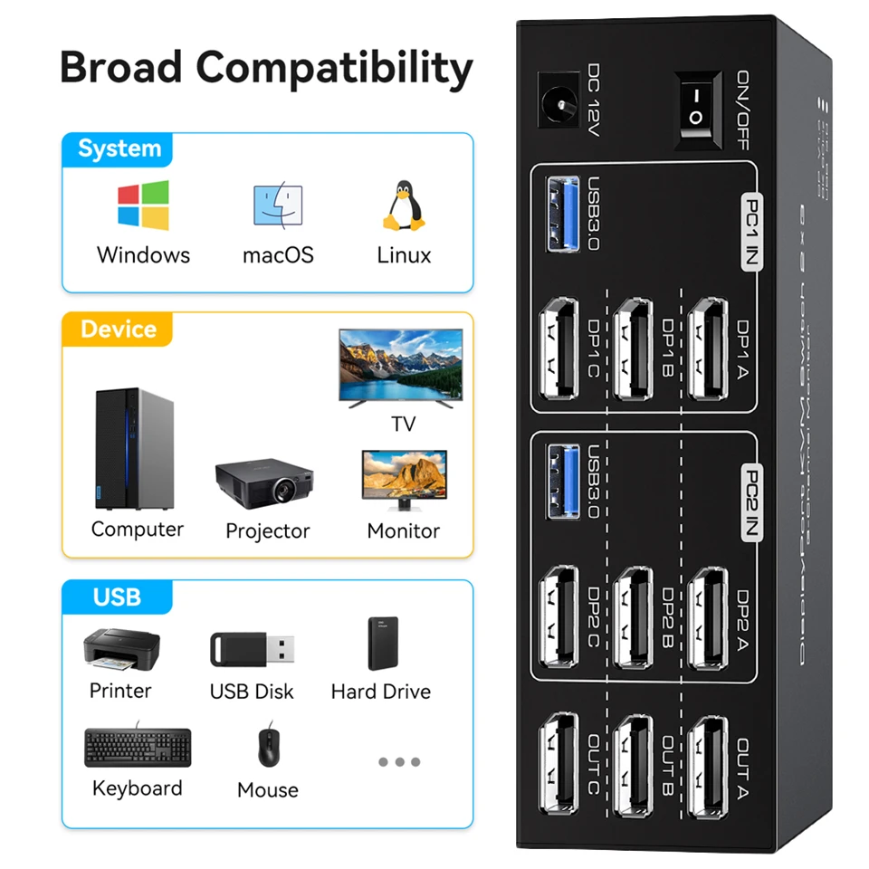 8K Triple Displayport USB 3.0 KVM Switch 3 Monitors 2 Computers 4K 144Hz 2×3 Triple Monitor HDMI DP KVM Switcher Keyboard Mouse