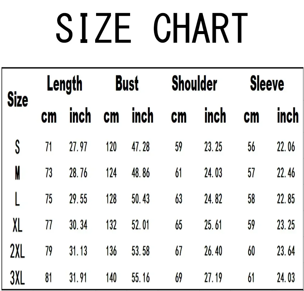Tips:you can choose the size of the clothes according to the size information in the picture, if you want a looser size, you can take one size up, if you can’t determine the size of the clothes, you can provide height and weight inquiry Customer service, we will recommend a size for you.