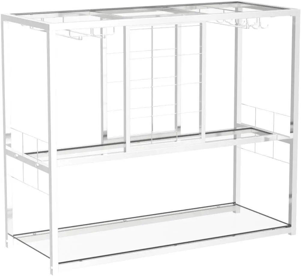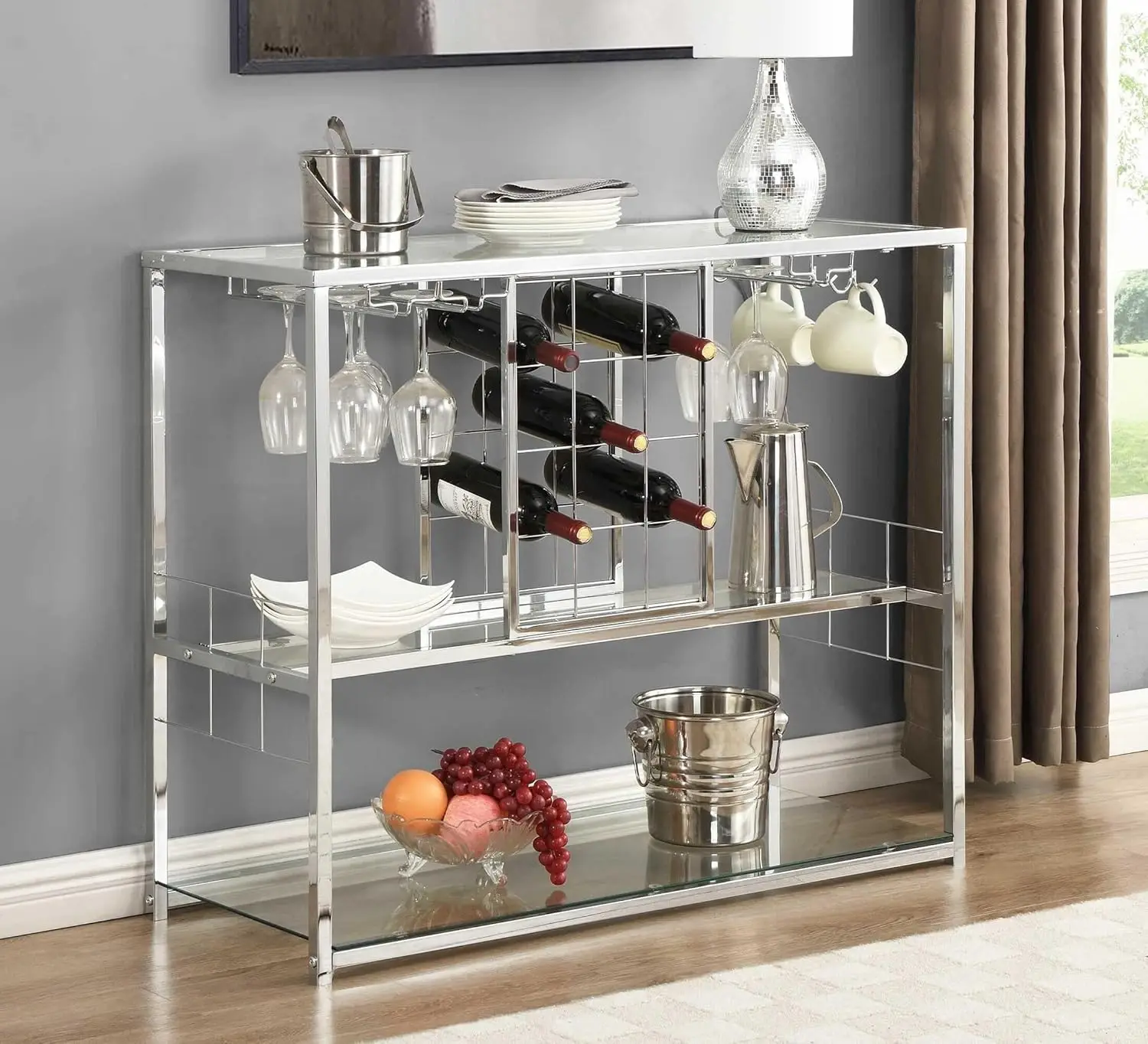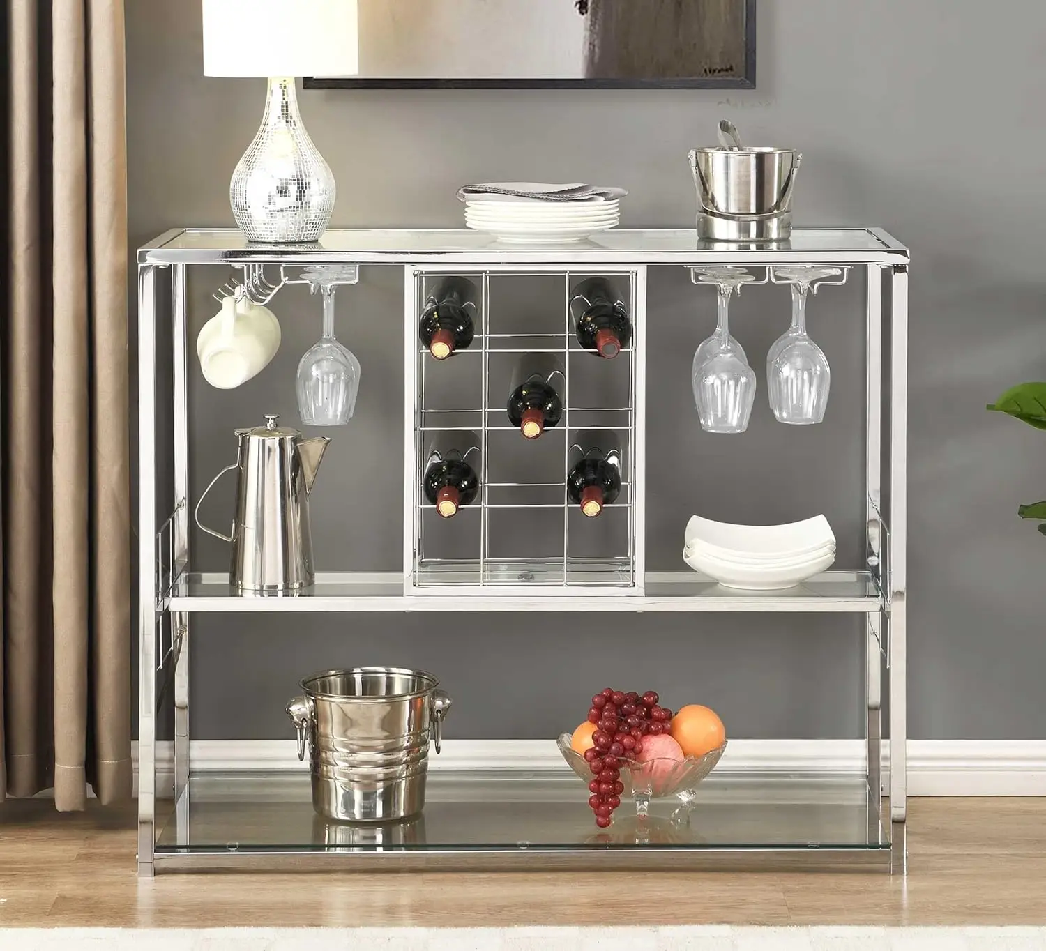 [Modern Design]-The Perfect Combination Of Clear Glass And Silver Finish Frame Gives This Wine Bar Cabinet A Fresh And Gorgeous Modern Look. The Metal Shines Against The Light, Adding An Elegant Charm To Your Cocktail Party.