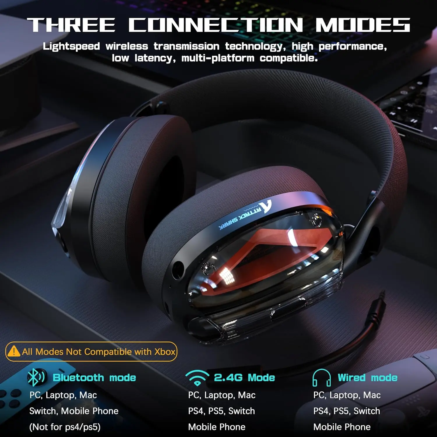 Wireless mode usage time: about 50 hours at 50% volume, Bluetooth standby time: about 200 hours at 50% volume, super long battery life. Type C charging cable, you can use it on a single charge, allowing you to enjoy uninterrupted competitive gaming with minimal downtime.LIGHTSPEED WIRELESS TECHNOLOGYATTACK SHARK SmartSwitch Dual Wireless headphones quickly toggle between HyperSpeed Wireless 2.4GHz and Bluetooth modes. Lossless audio for low-latency wireless gaming, with high-speed transmission and extremely low latency, ensuring lossless audio is always in sync with your game.