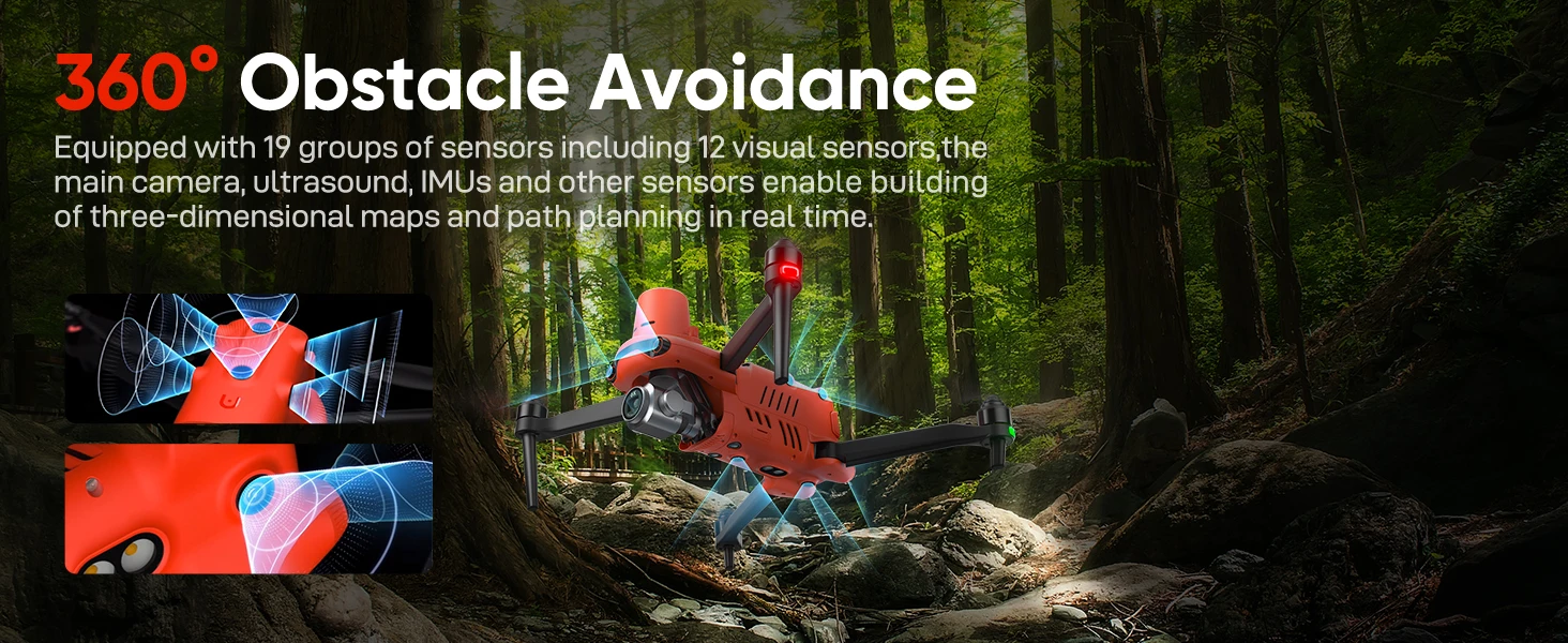 Equipped with 19 groups of sensors including 12 visual sensors, the main camera, ultrasound, IMUs, and other sensors enables the building of three-dimensional maps and path planning in real-time.