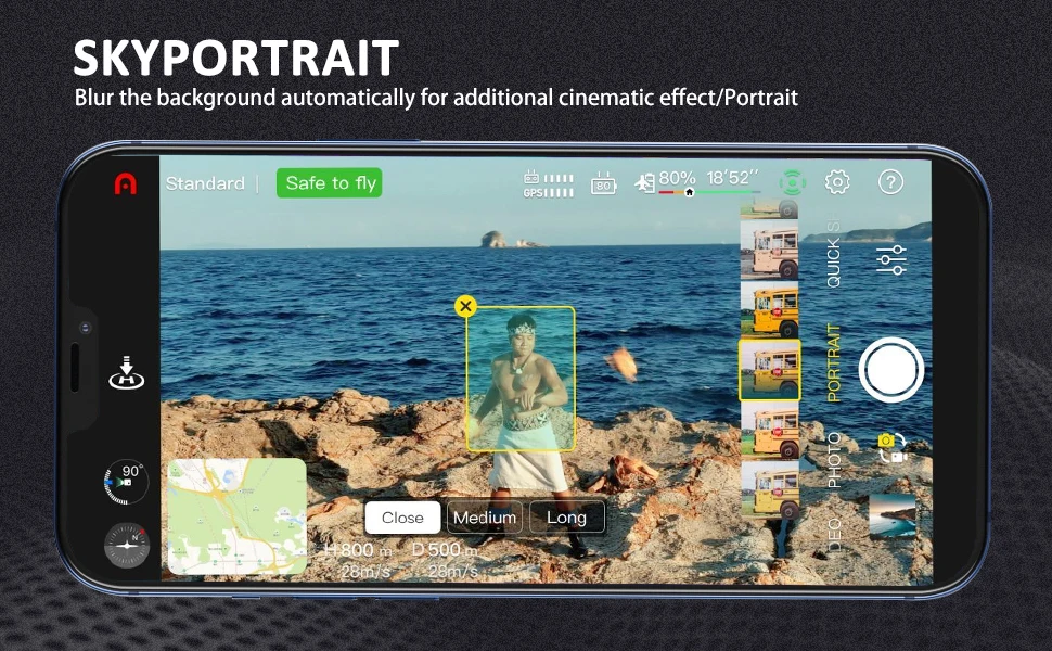 Take the ultimate selfie with the press of a single button. When engaged, SkyPortrait will raise your EVO Nano+ into the air where it will snap a photo, automatically adjusting the lens to include everyone. You can even have the Nano+ automatically blur out the background to focus only on you and your friends for additional cinematic effect/Portrait.
