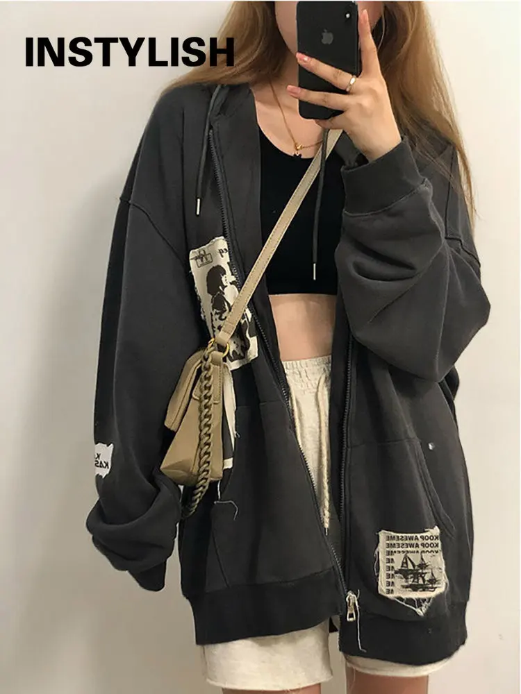Autumn Vintage Patch Stitch Zip Up Hoodies Korean Fashion Harajuku Y2K Streetwear Grunge Hooded Sweatshirt Oversized Jacket Tops