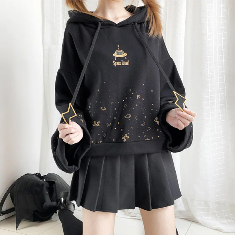 Autumn Women Kawaii Short Hoodie Harajuku Flare Long Sleeve Starry Sky Print Lightning Embroidery Drawstring Hooded Sweatshirt