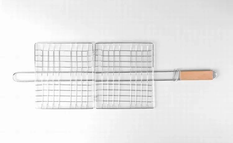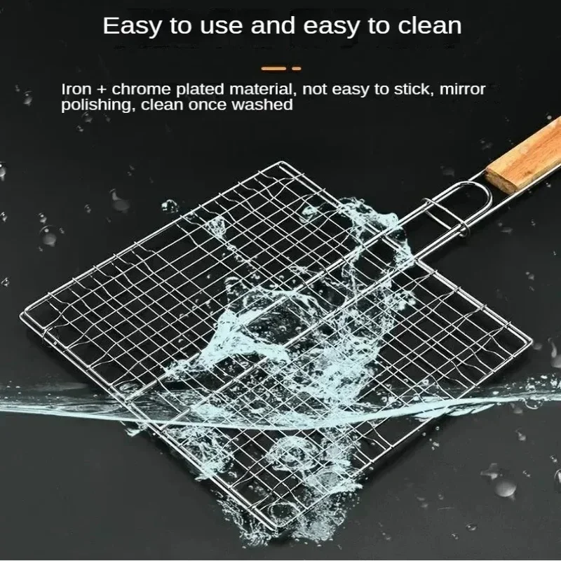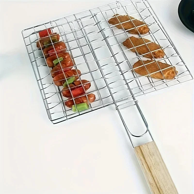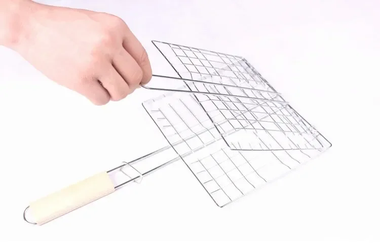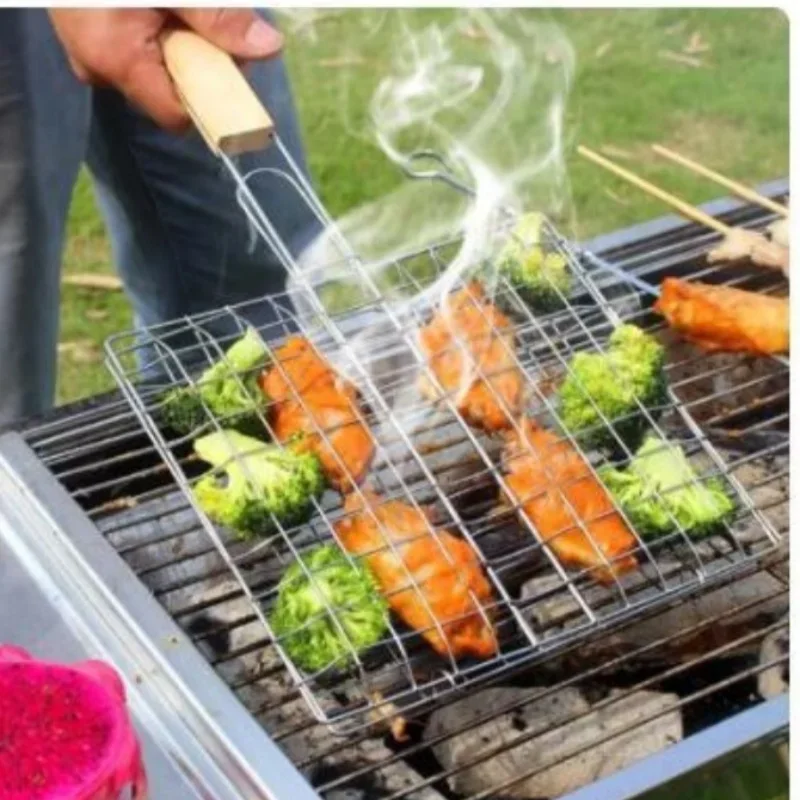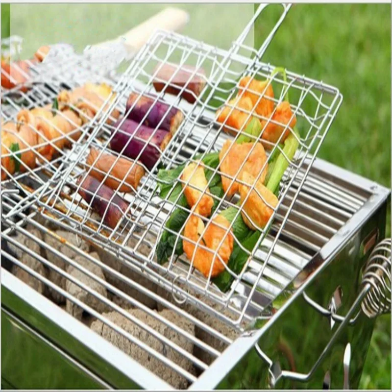 Barbecue Grilling Basket Stainless Steel Folding Portable Non Stick BBQ Grill Mesh Rack with Wooden Handle Outdoor Cookware Tool