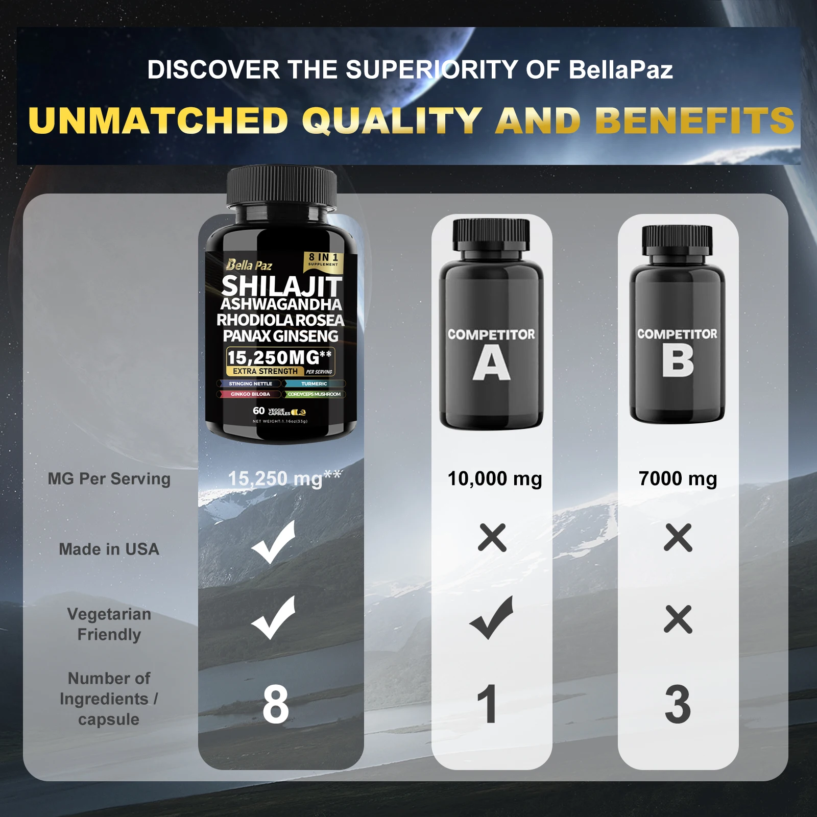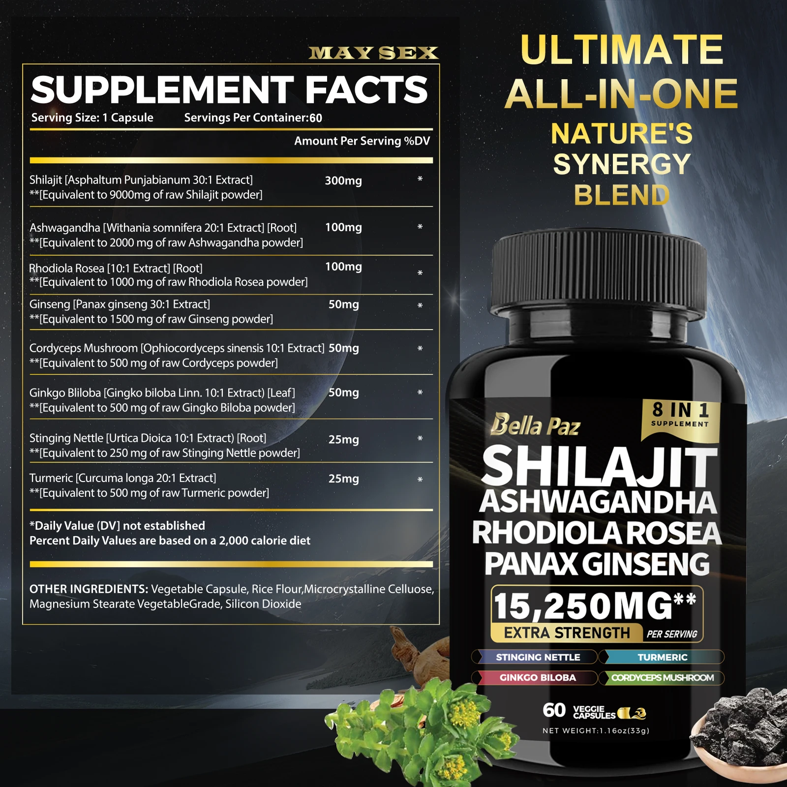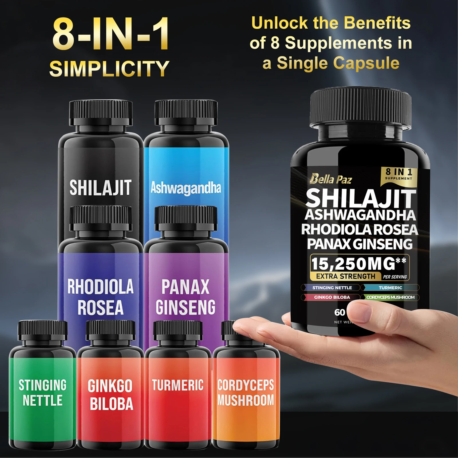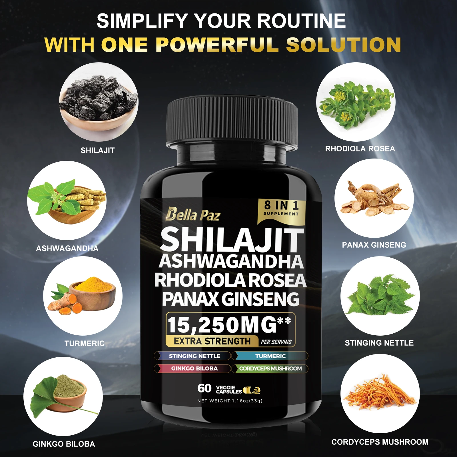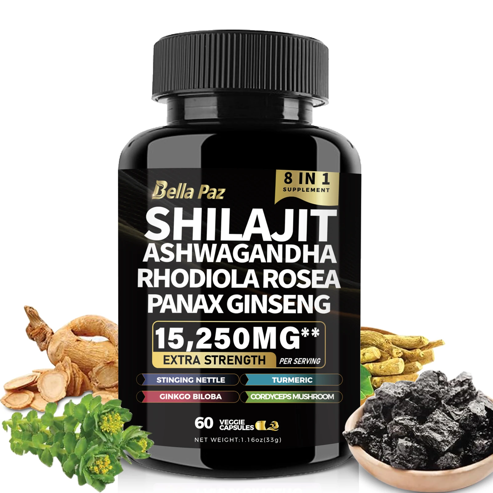 BellaPaz Shilajit 9000 with Panax Ginseng 1500mg, Ashwagandha 2000mg, Rhodiola Rosea 1000mg, and more in 60 capsules.