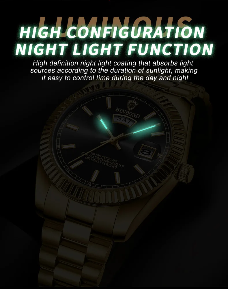 BINBOND B7012 Mens Fashion Business Sports Quartz Watch 30M Waterproof Luminous Classic Calendar Creative Clock Mens Wristwatch