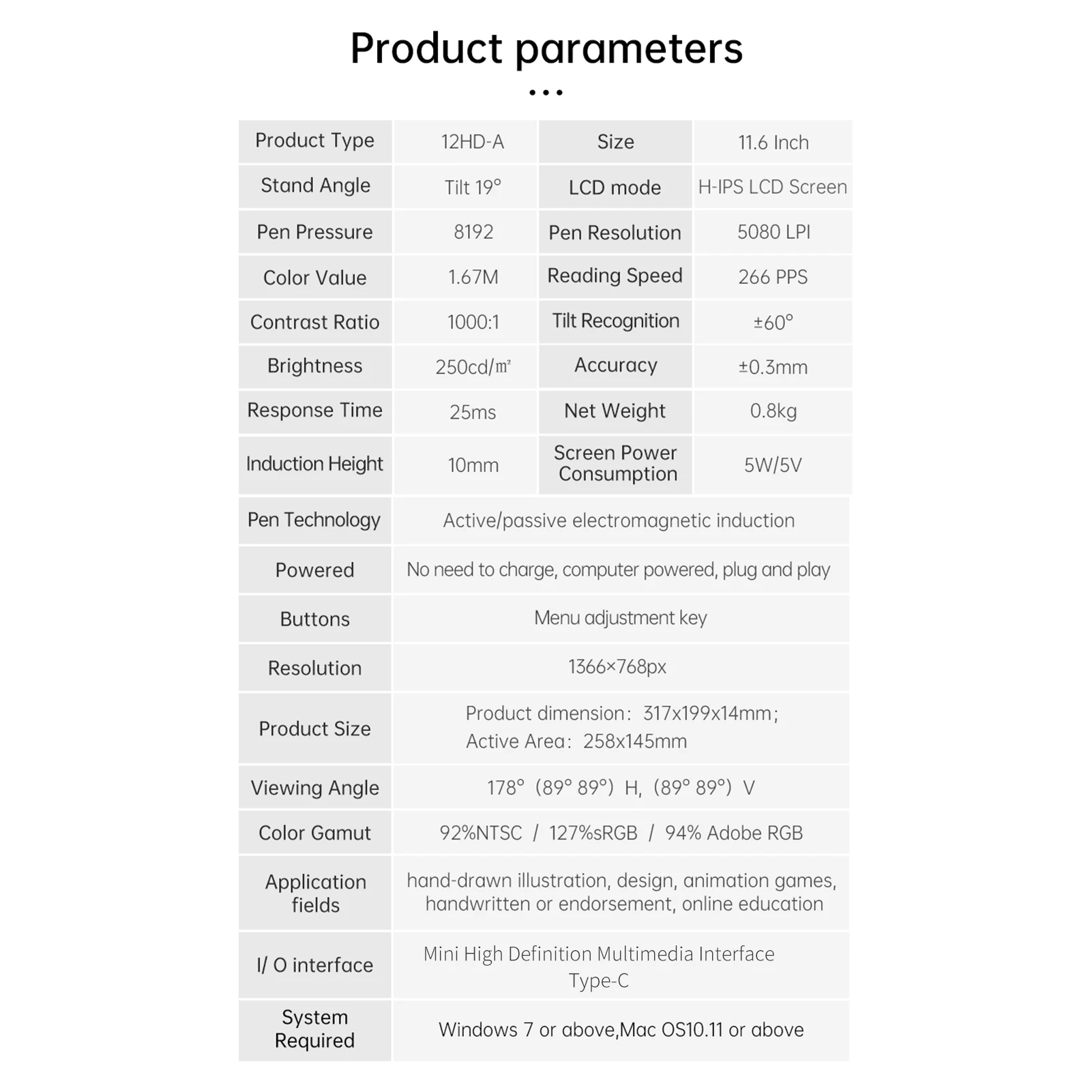 BOSTO 12HD-A H-IPS LCD Graphics Drawing Tablet Monitor 11.6 Inch Size 1366×768 Display 8192 Pressure Level Passive Technology