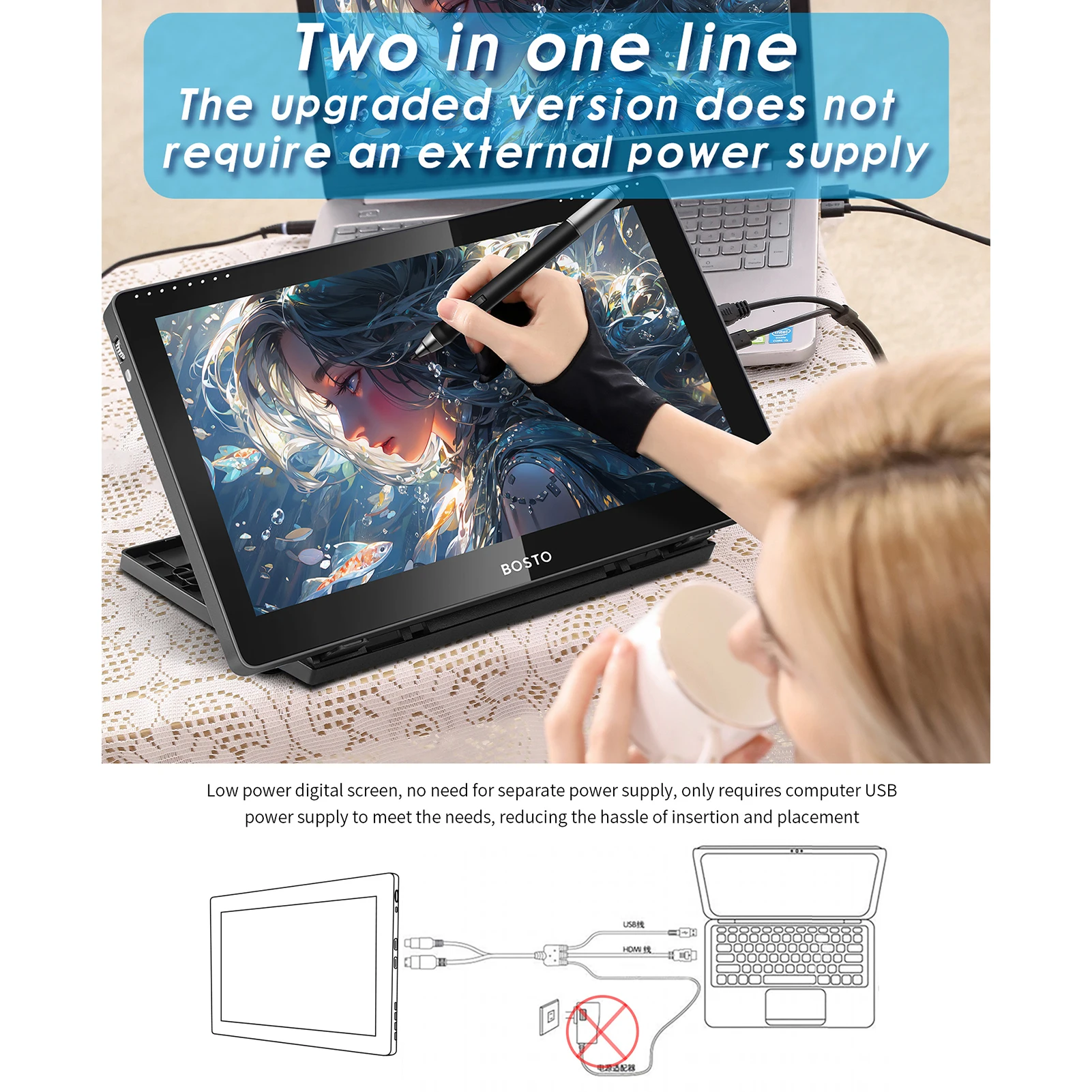 BOSTO 16HD 15.6 Inch IPS Graphics Drawing Tablet 1920*1080 Monitor 16K Pressure Level w/ Rechargeable Stylus Pen/ 20pcs Pen Nips