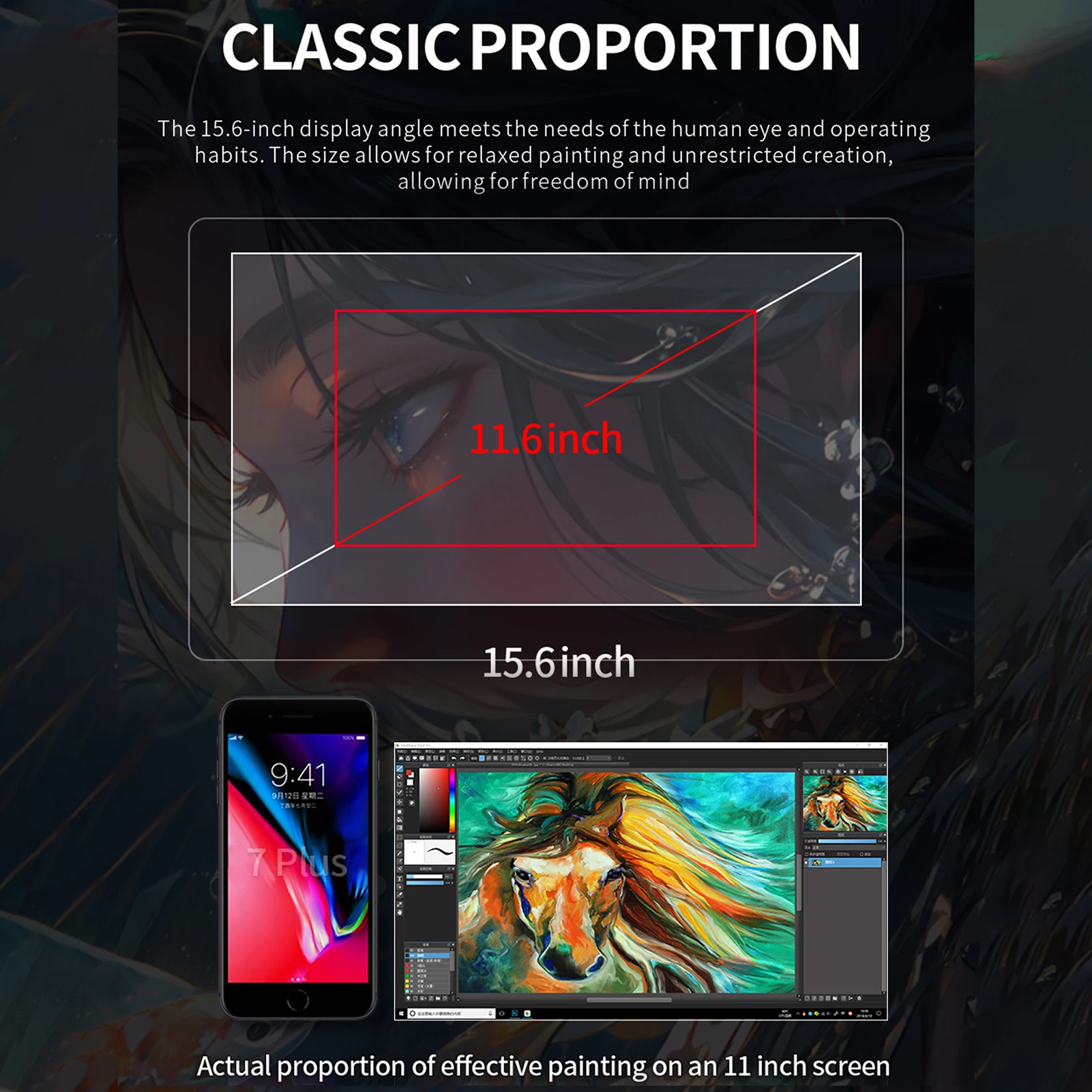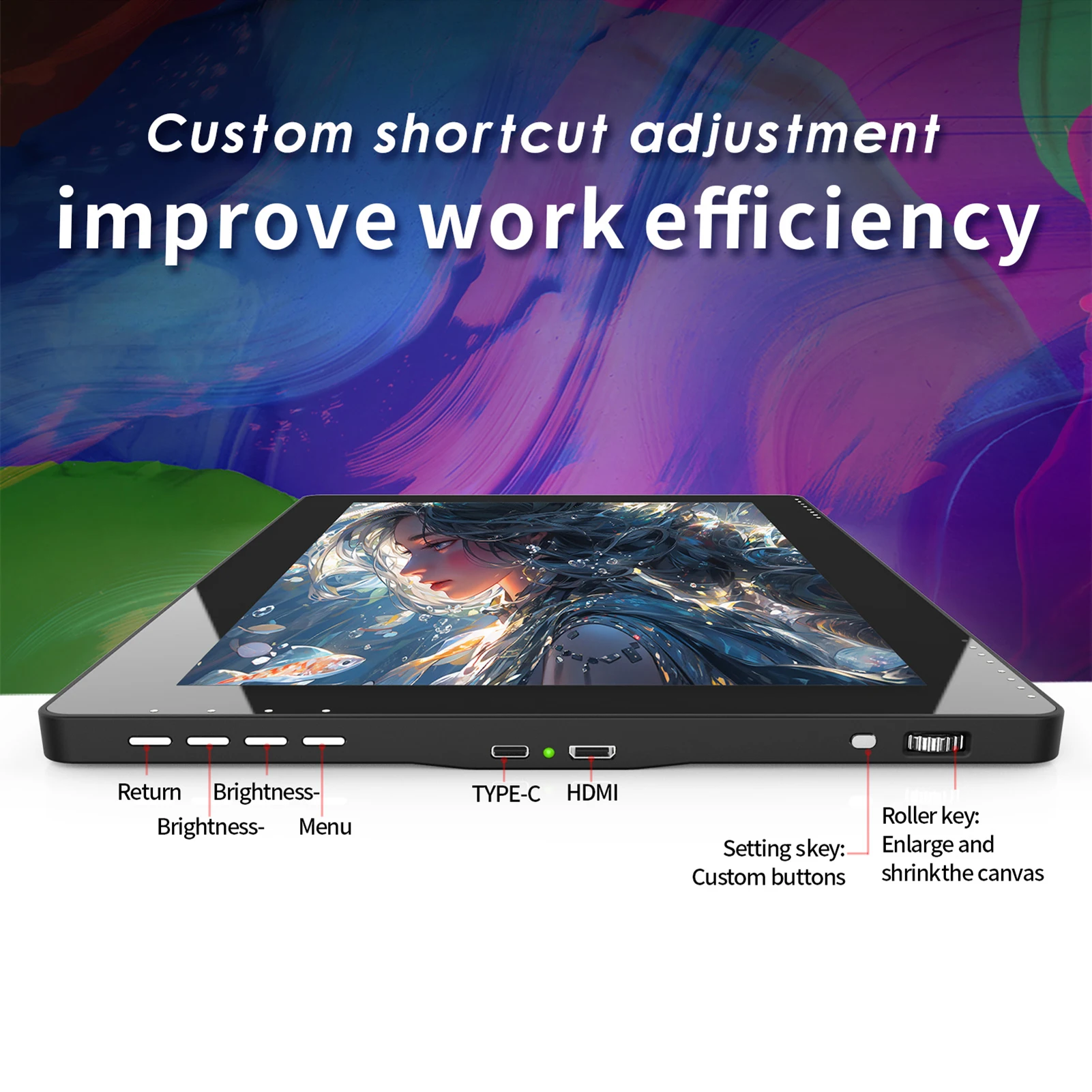 Display Effect: 13.4 x 7.7 inch large active drawing area, 1920 * 1080 high resolution, 16.7M abundant color depth, 1000:1 contrast ratio, 250cd/㎡ brightness and 178° viewing angle, which can delivery large, clear and abundant display effect in front of you.