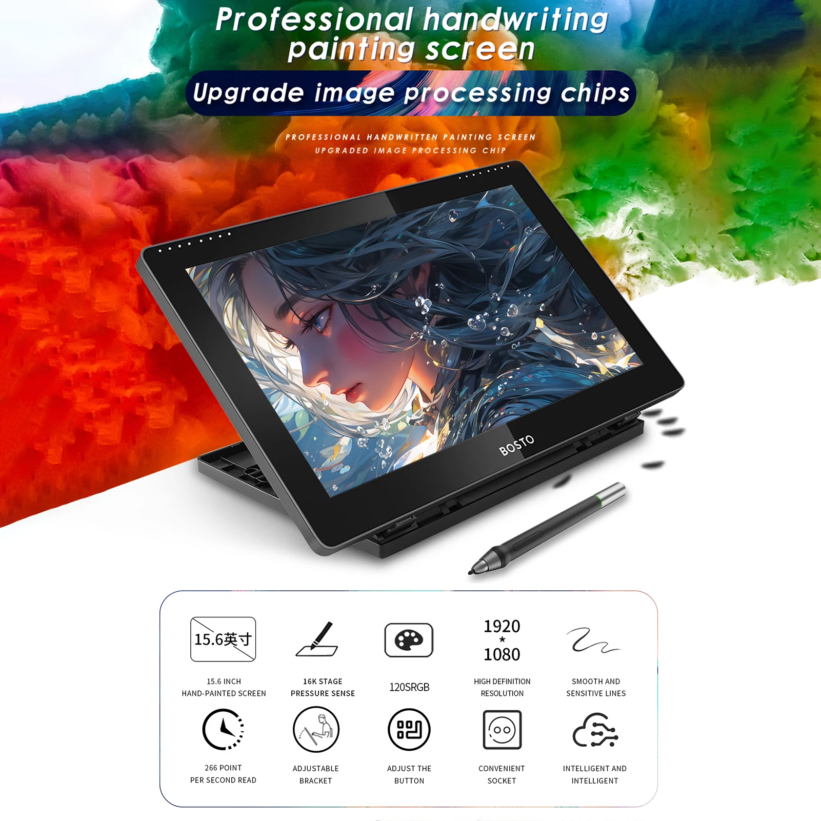 BOSTO 16HD 15.6 Inch IPS Graphics Drawing Tablet Display Monitor 1920*1080 High Resolution 16K Pressure Level with Stylus Pen