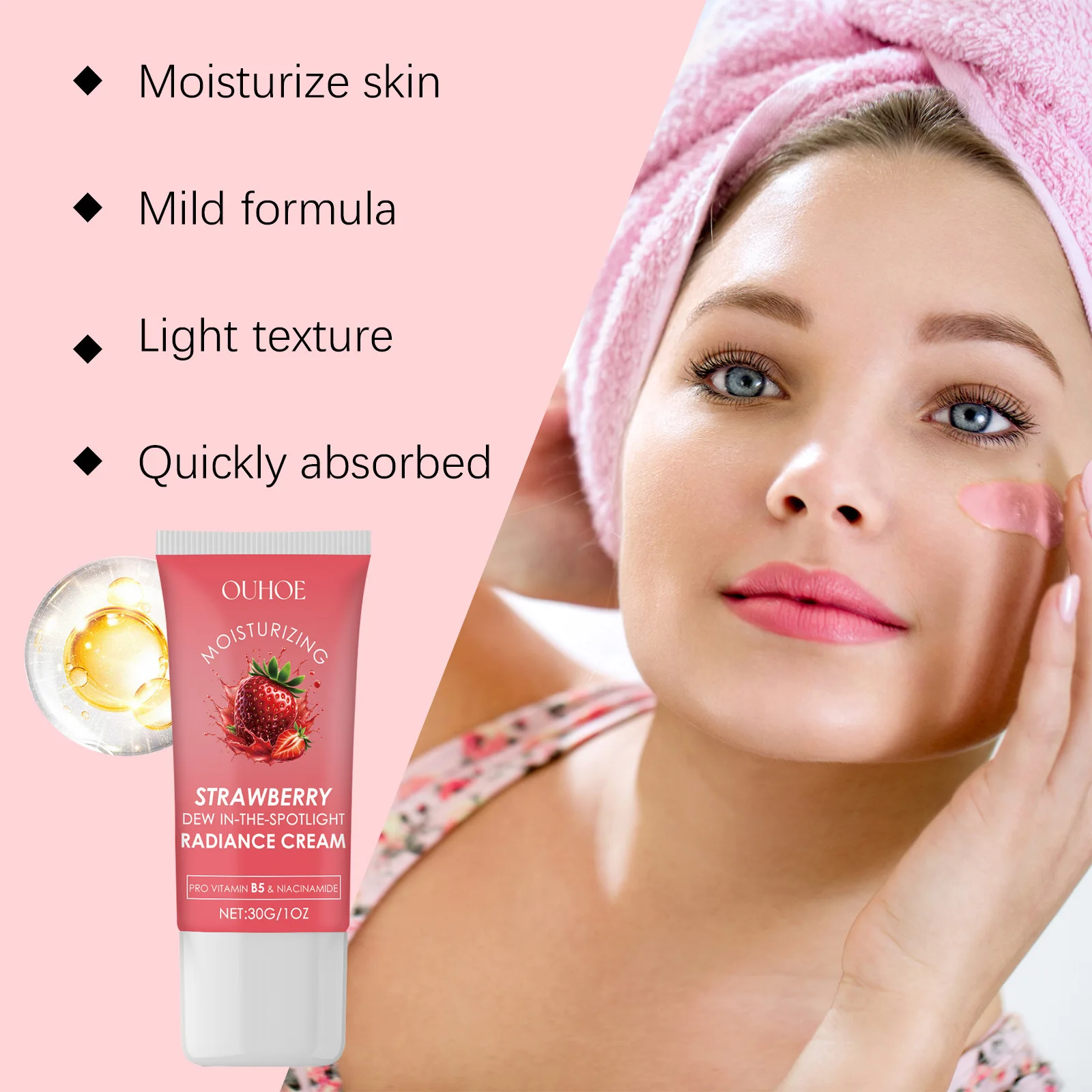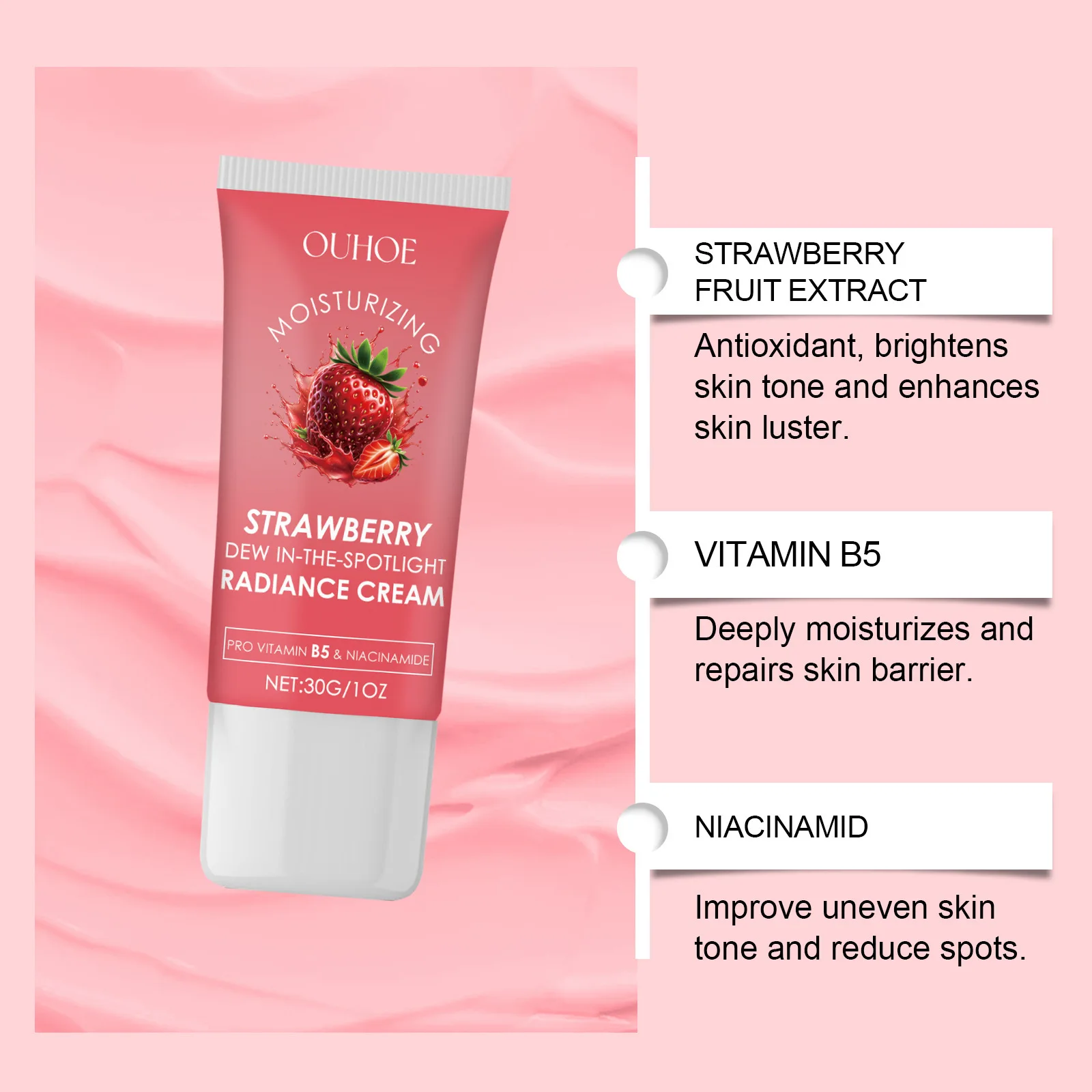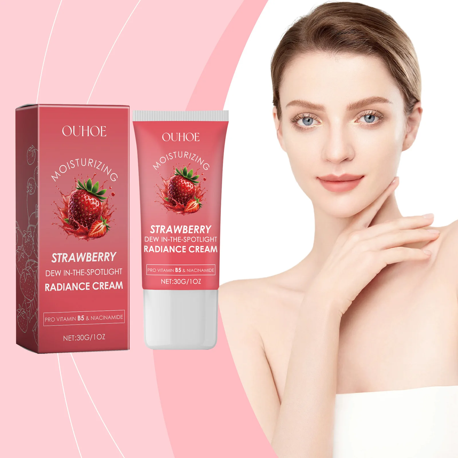 3. Strawberry brightening face cream effectively targeting dull skin, brightening skin tone, removing dark spots, reducing pigmentation, repairing dullness, improving skin texture, achieving even skin tone, and maintaining skin brightness