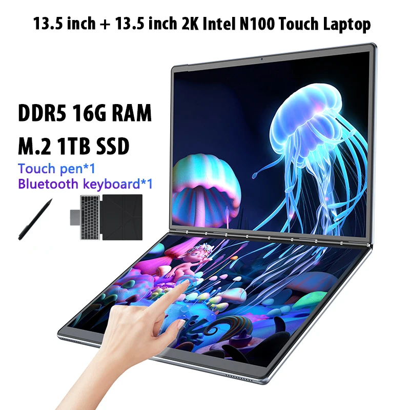 BYONE BY135 Dual Screen Laptop Intel N100 DDR5 16G RAM M.2 SSD 13.5 Inch 2.5K Touch Screen Notebook 9000Mah Computer PC Office