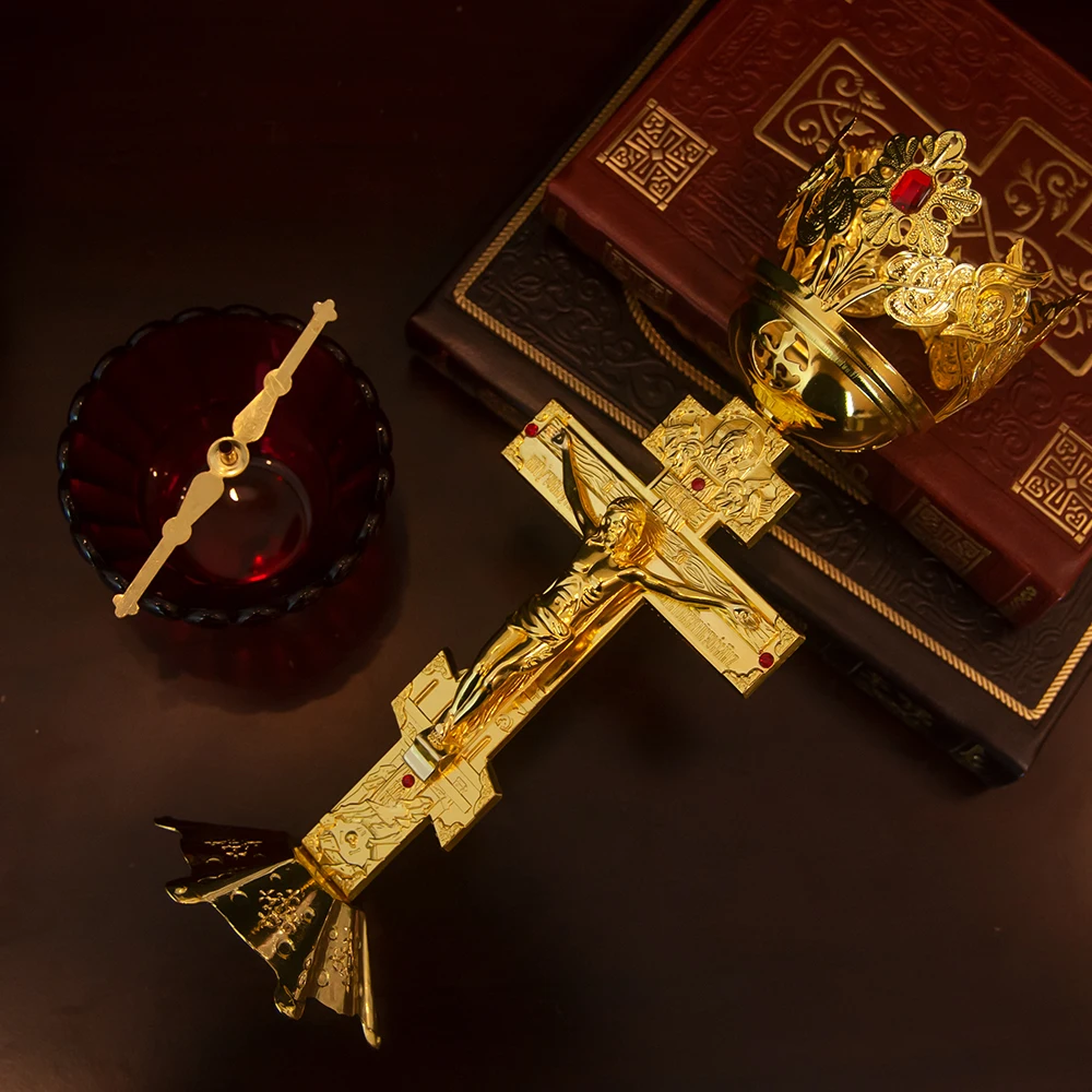 Church family dining table decorated with vertical metal candle holders, Catholic Jesus Church candle holders