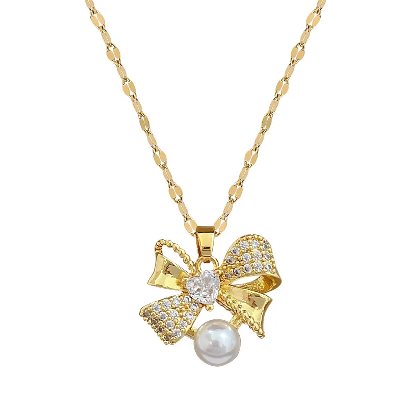 Classic Stainless Steel Gorgeous Pearl Bow Necklace Earrings Fashionable and Exquisite Temperament Evening Accessories