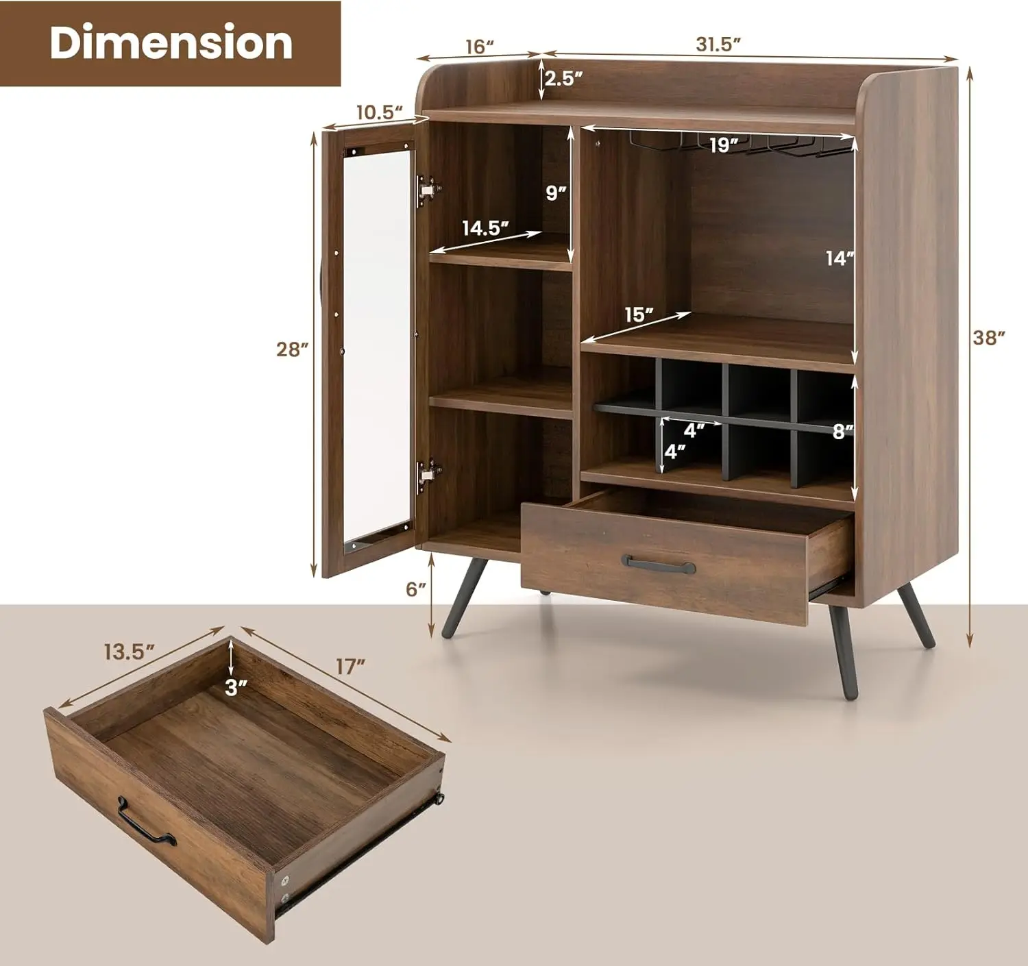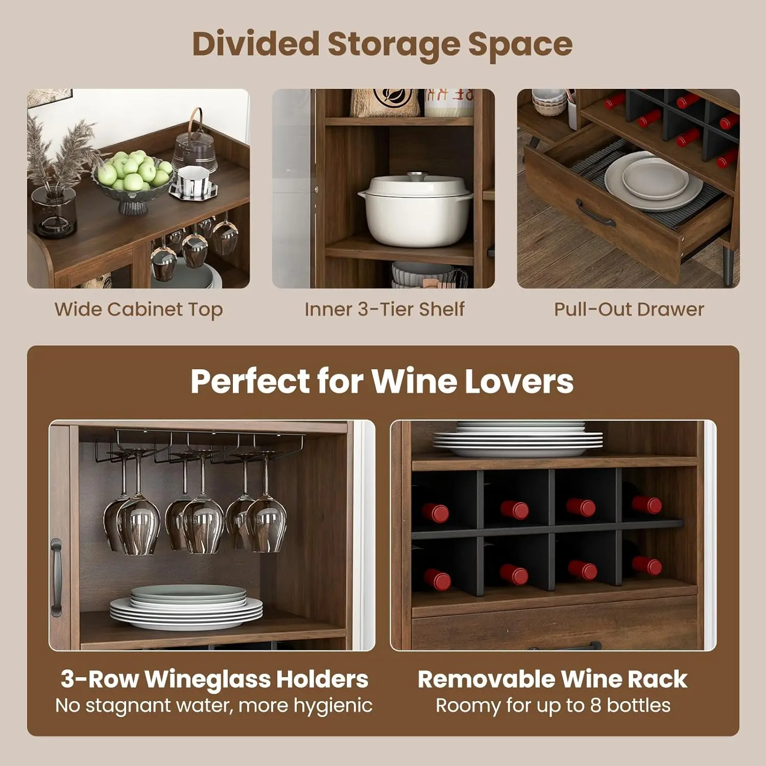 【Universal Storage Space】 This Wine Cabinet Features An Open Countertop With 2.5″” High Baffles, Providing Easy Access To Your Kitchen Tools. Additionally, The Bar Cabinet Offers A 3-Tier Shelf And A Pull-Out Drawer, Which Provide Enclosed And Dust-Free Space For Your Tableware.