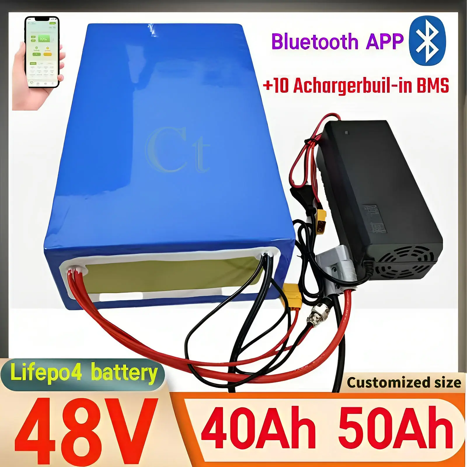 CT Batterie au lithium Lifepo4, 48V, 50Ah, 40Ah, Bluetooth BMS, 16S, 2000W, pour scooter, vélo, tricycle, bateau, Go Cart, charg