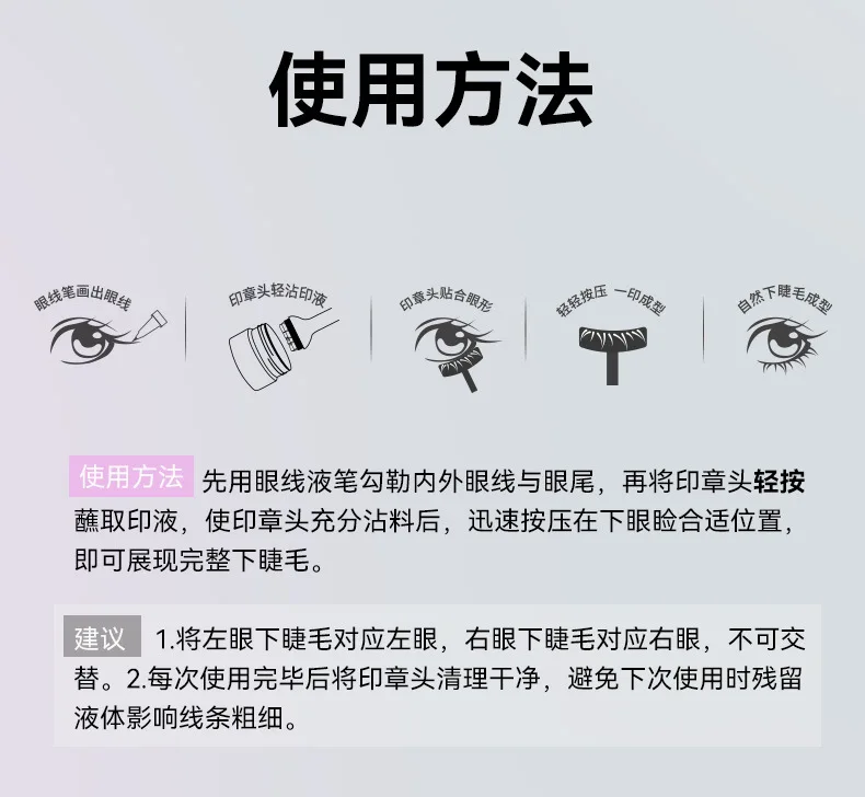 [How to use] Wash the Lower Lash Stamp, keep it dry when using it, Dip your lower lash stamps into the eyeliner Lash Stamp Liquid . (Note: Dip only the raised portion of the Lower Lash Stamp into the cream), apply the Lower Lash Stamp to the right spot on your face, leave it on for 1-2 seconds, and then remove the Lower Lash Stamp.