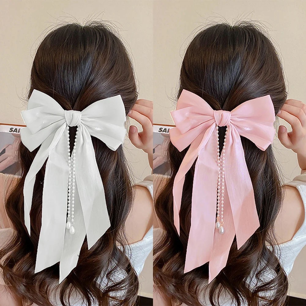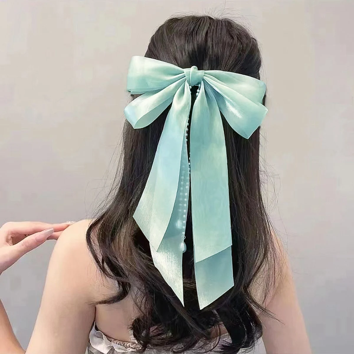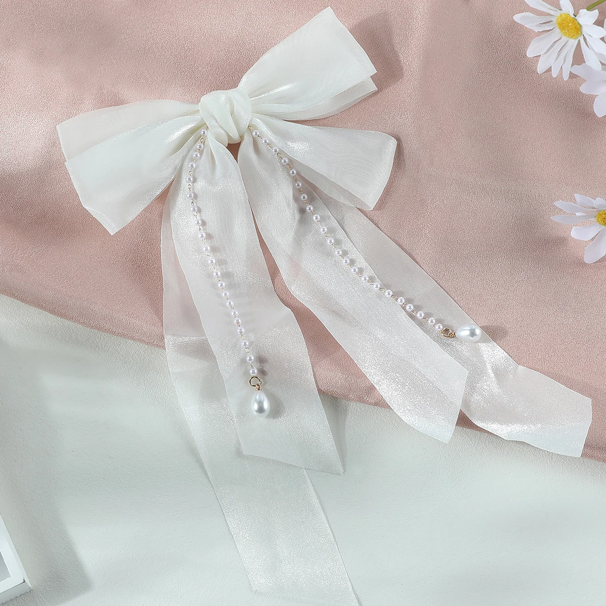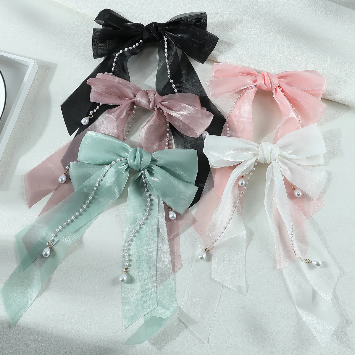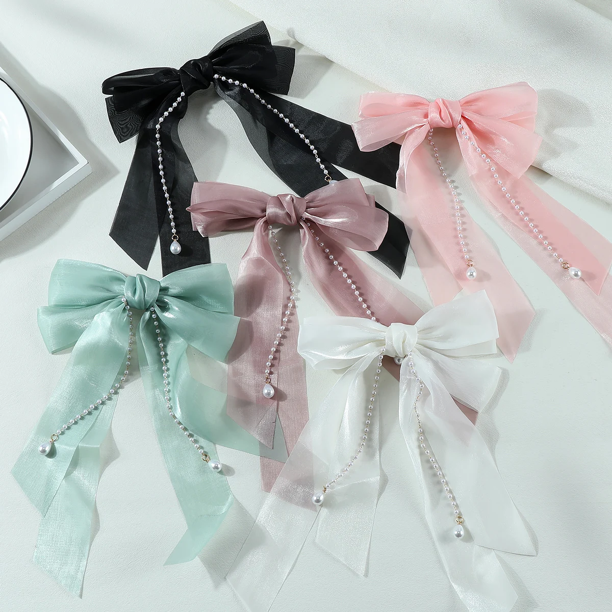 Elegant Long Pearl Tassel Bow Hair Clip for Women Fashion Simple Mesh Bow Hairpins Girls Solid Spring Clip Hair Accessories