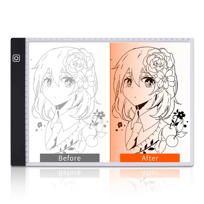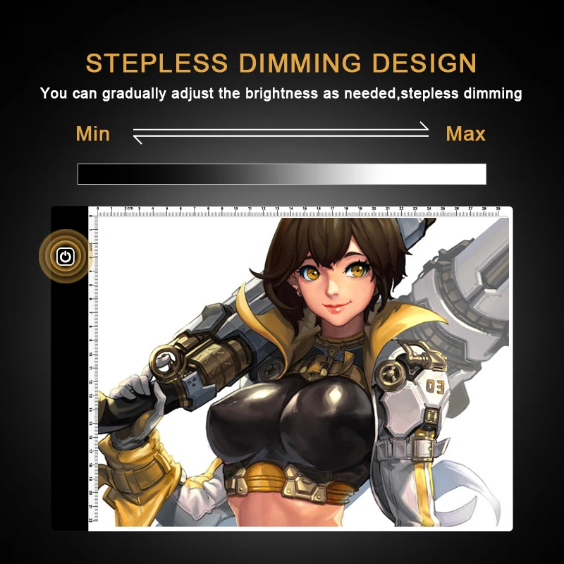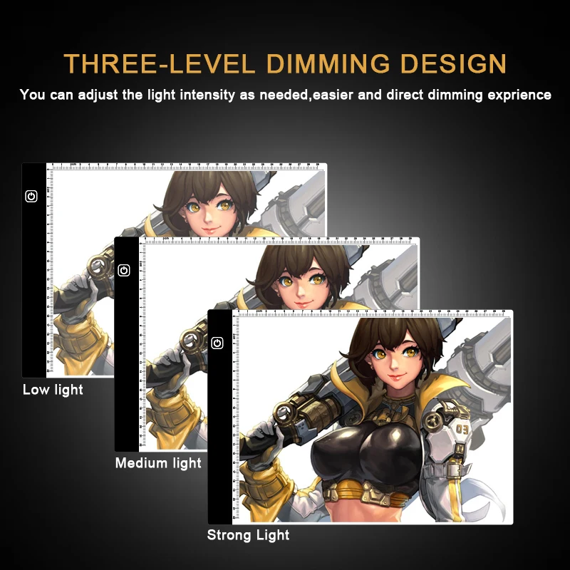 A4 LED light board pad – You can choose low-middle-high level to adjust brightness by pressing the button. Just touch sensor switch design, turn on/off and brightness control easily by touching one time to choose one level.