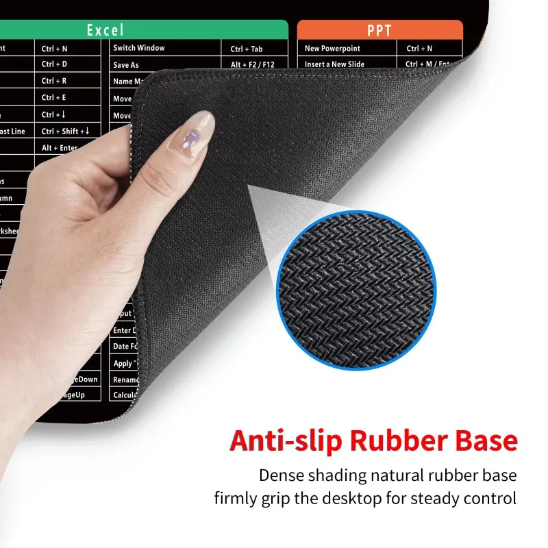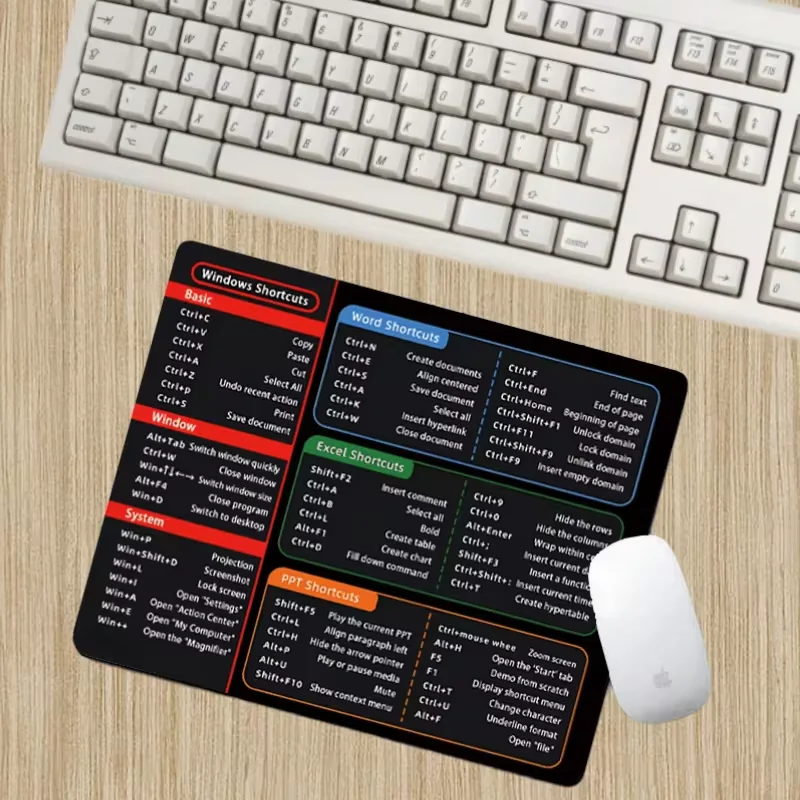 This mouse pad is not only a traditional mouse use pad, but also a practical computer shortcut key learning tool. The surface is printed with the Windows operating system, Microsoft Office (including Word, Excel, PPT, etc.) and other commonly used software shortcuts and function lists, to help users quickly grasp the shortcuts of various computer operations, improve work efficiency.