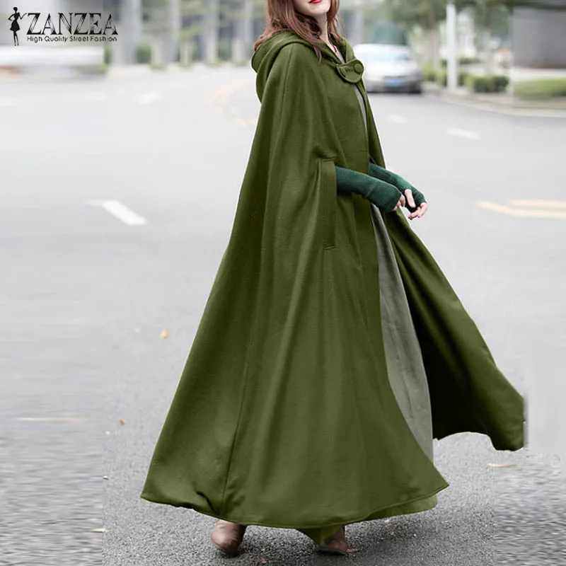 Fashion Long Cape Cloak ZANZEA Women Hooded Wool Blend Cloak Coat Autumn Hoodies Poncho Warm Cosplay Jackets Outwear Windbreaker