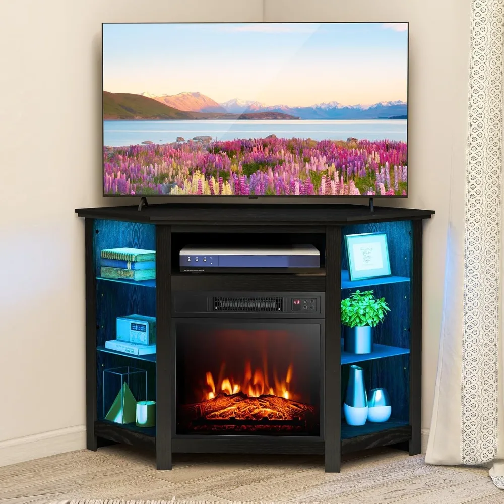 - [TV Stand & Fireplace Combo] This corner TV stand comes with an electric fireplace, perfectly satisfies your multiple demands.The retro appearance and wood-like surface with the vivid flame effect and LED brightness add beauty to your living space.And the unique shape of the TV stand fits every corner of your room well.