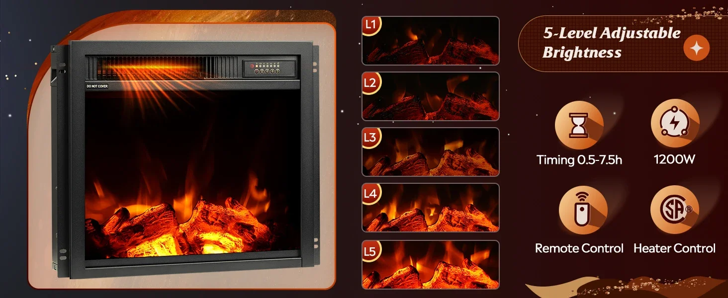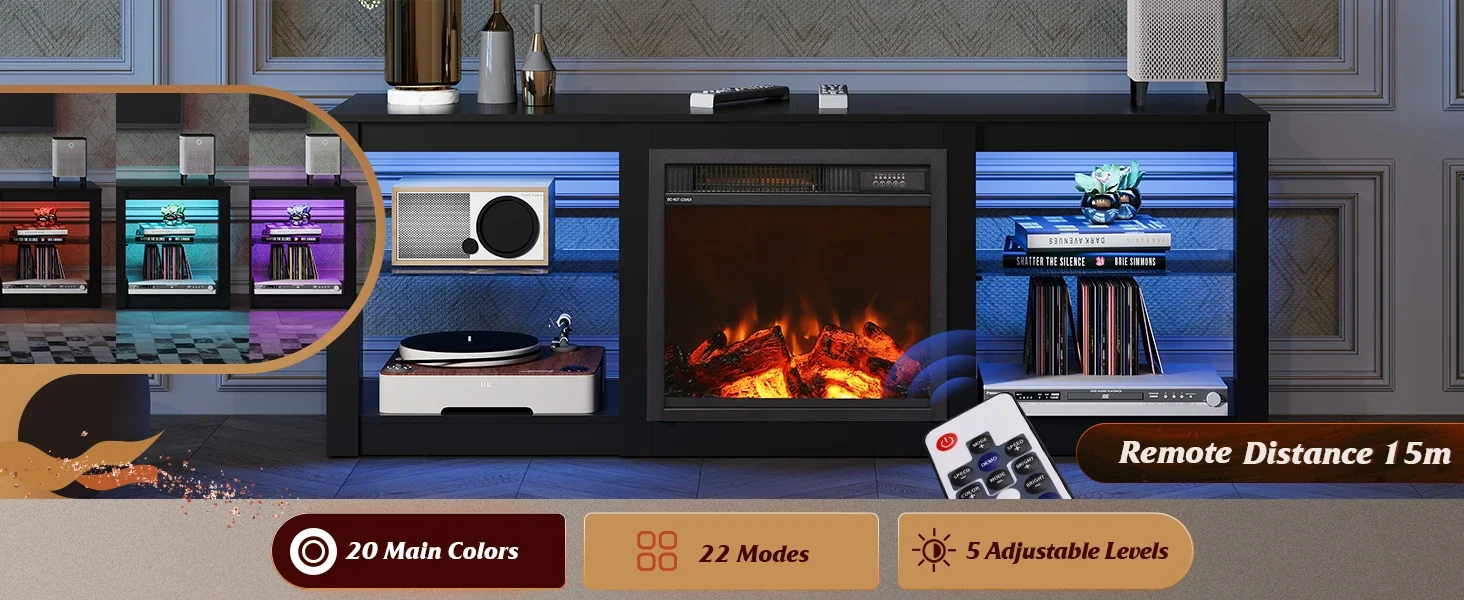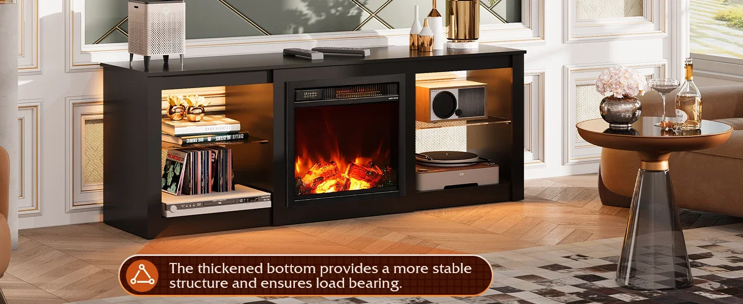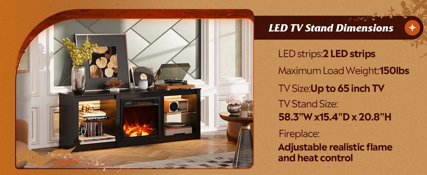 - 【Fireplace TV Stand with Heater】This 58 “W x 14.6 “D x 27 “H TV stand has a 18-inch built-in electric fireplace heater with 2-level heating adjustment, which has a great heating ytem kick off a lot of heat, setting a vibe of warm and stylish in the living room.The Media Center equipped with an auto shut-off timer that can be set for up to 7.5 hours.