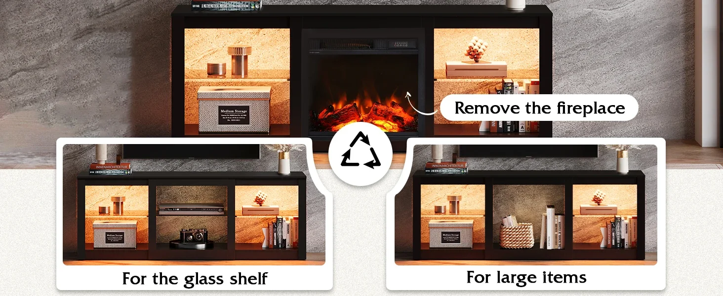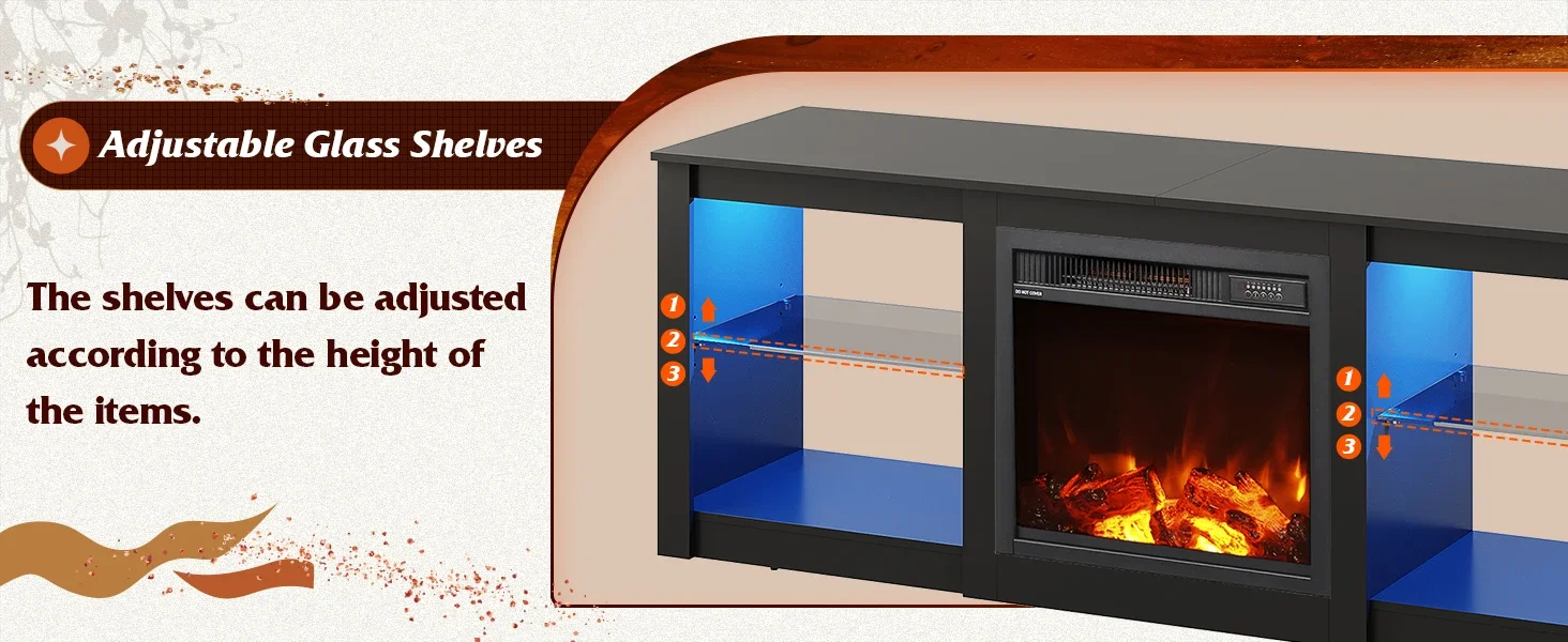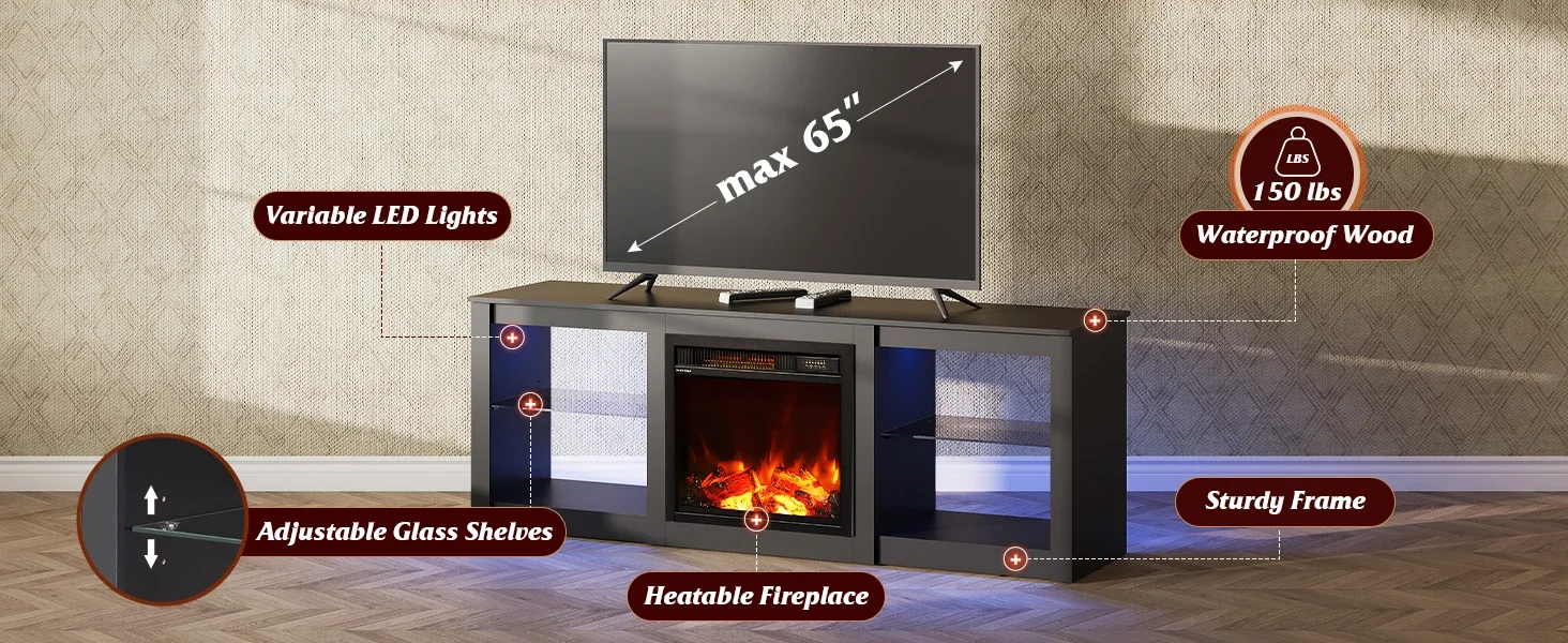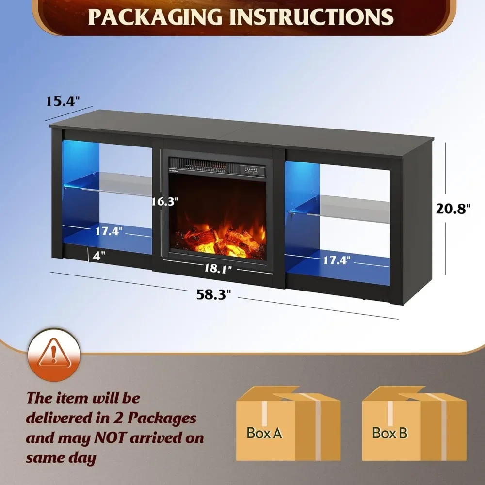 Fireplace TV Stand with LED Lights & Glass Shelves, Modern Entertainment Console 58 Inch TV Console