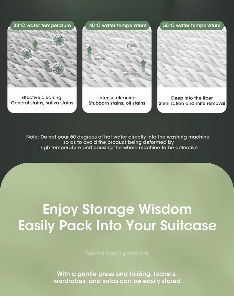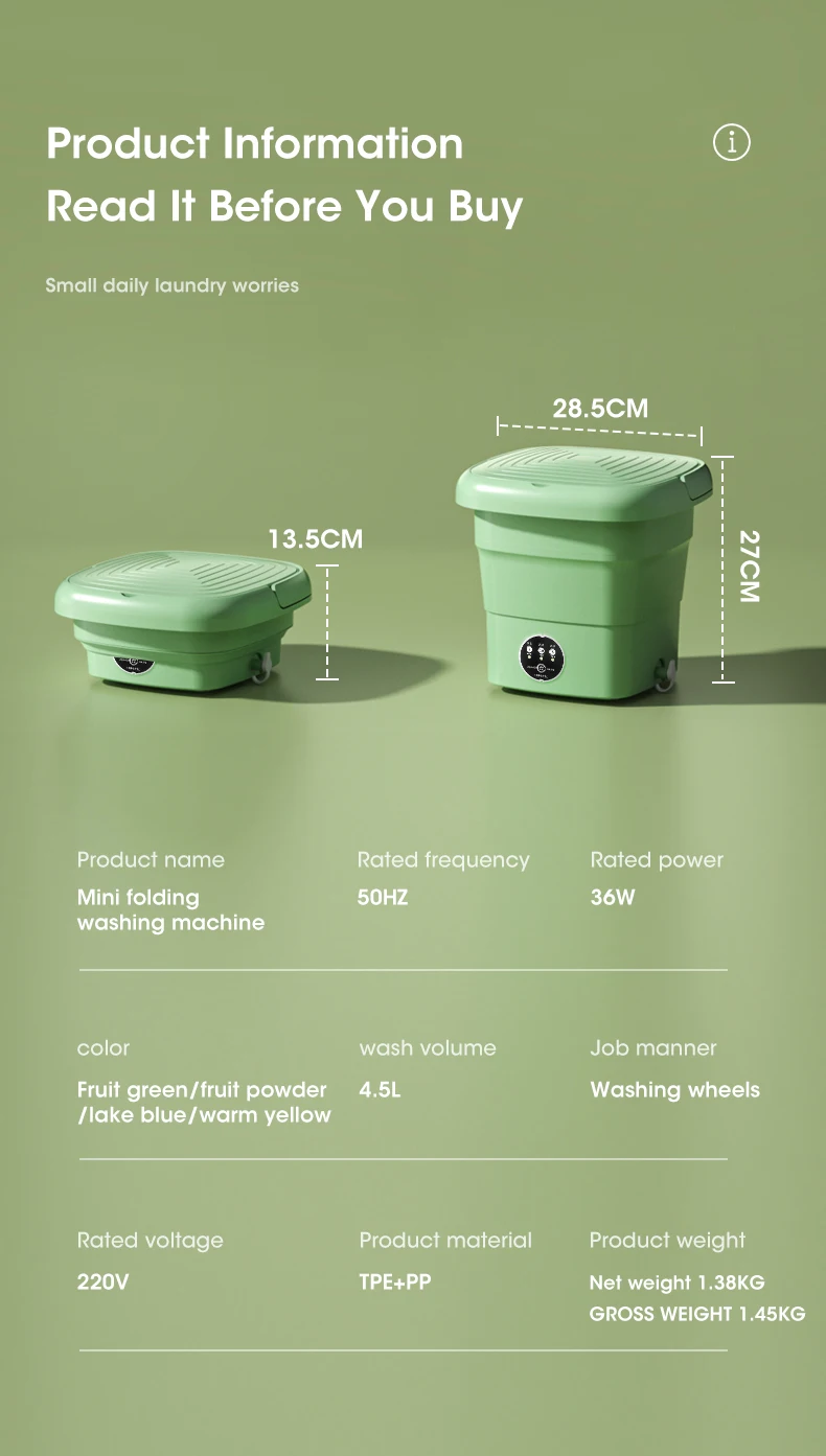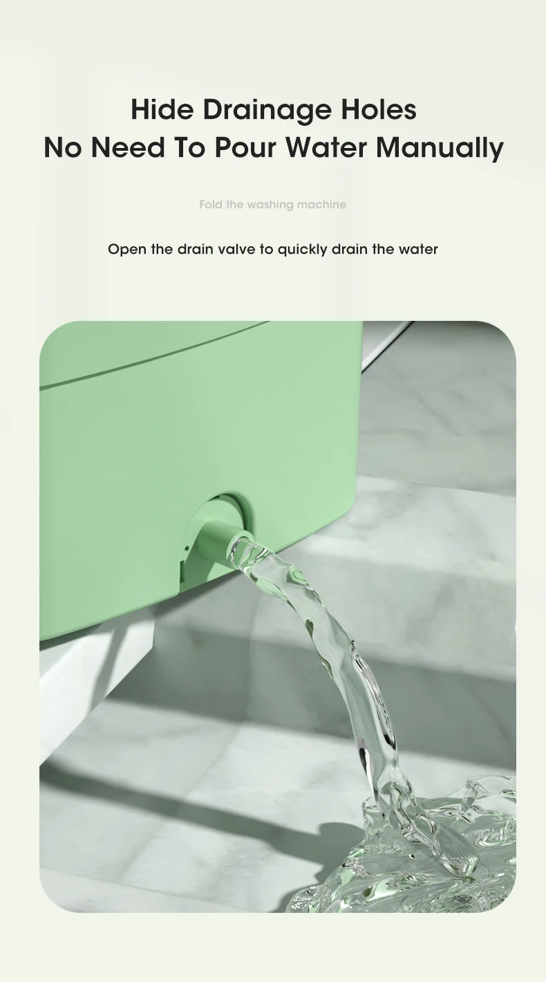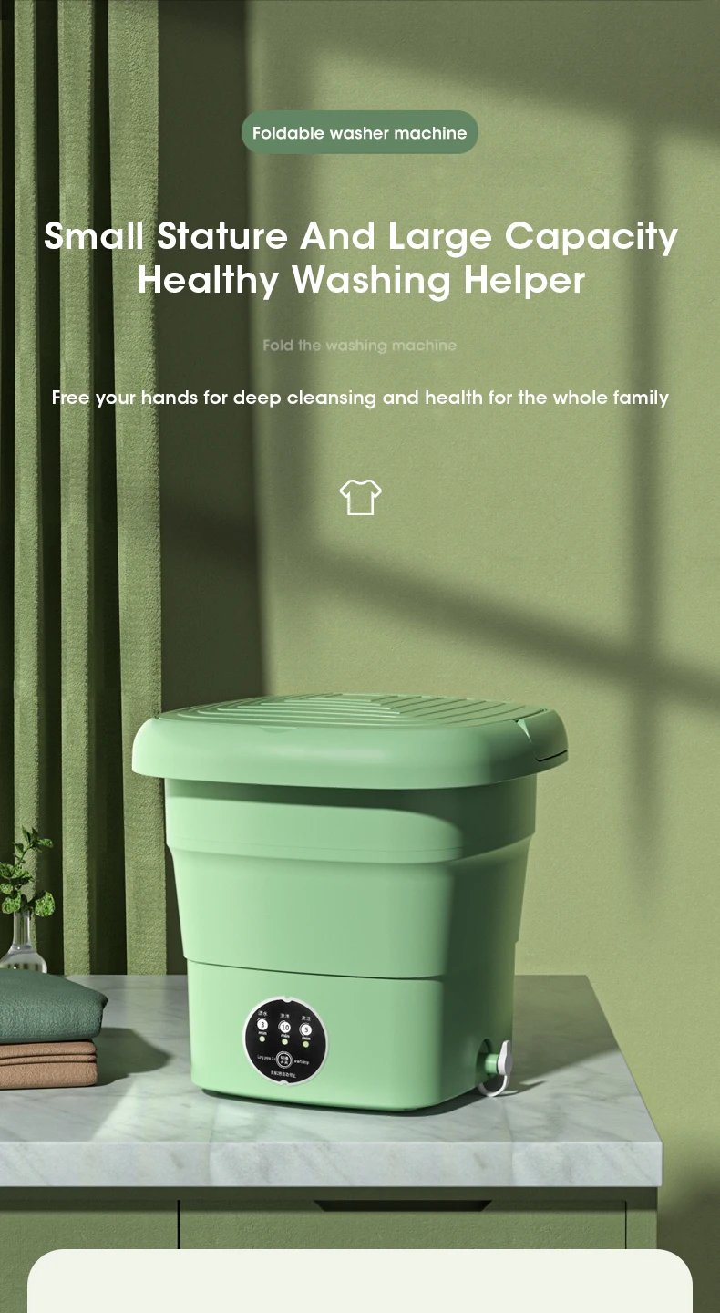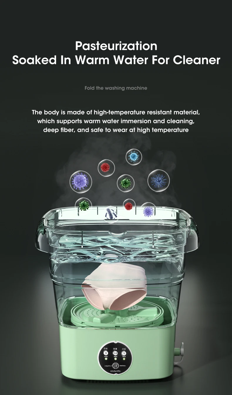 Folding Washing Machine: This washing machine is foldable so that you can easily take it with you, suitable for home use and on travel. It is suitable for student dormitories, apartments, old people’s homes, travel, camping, business trip etc.